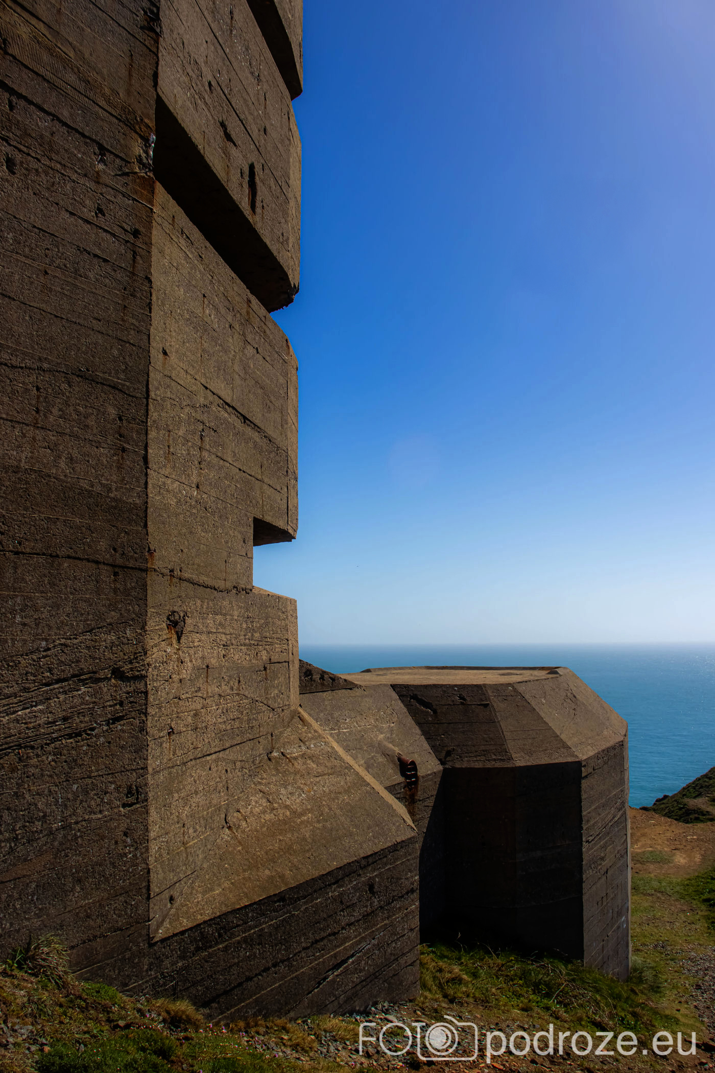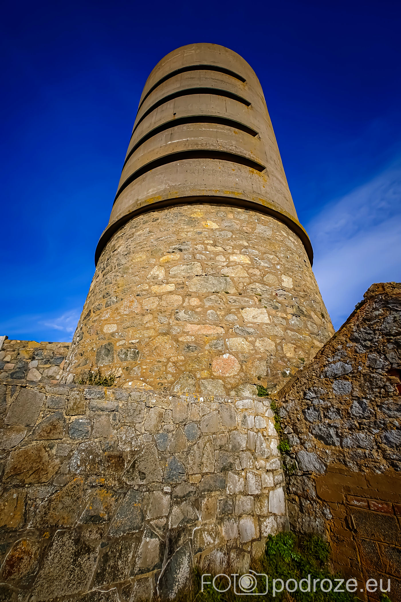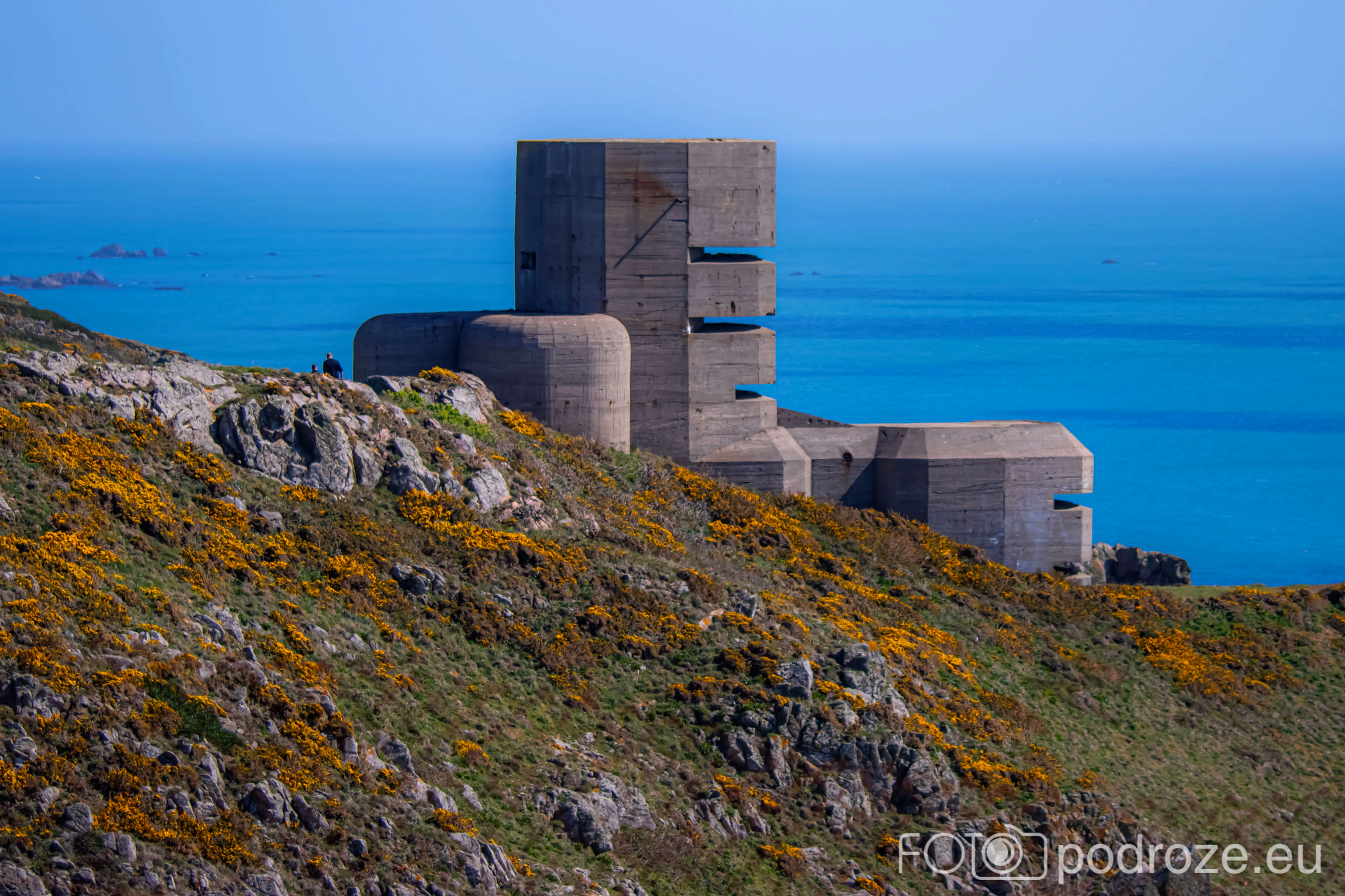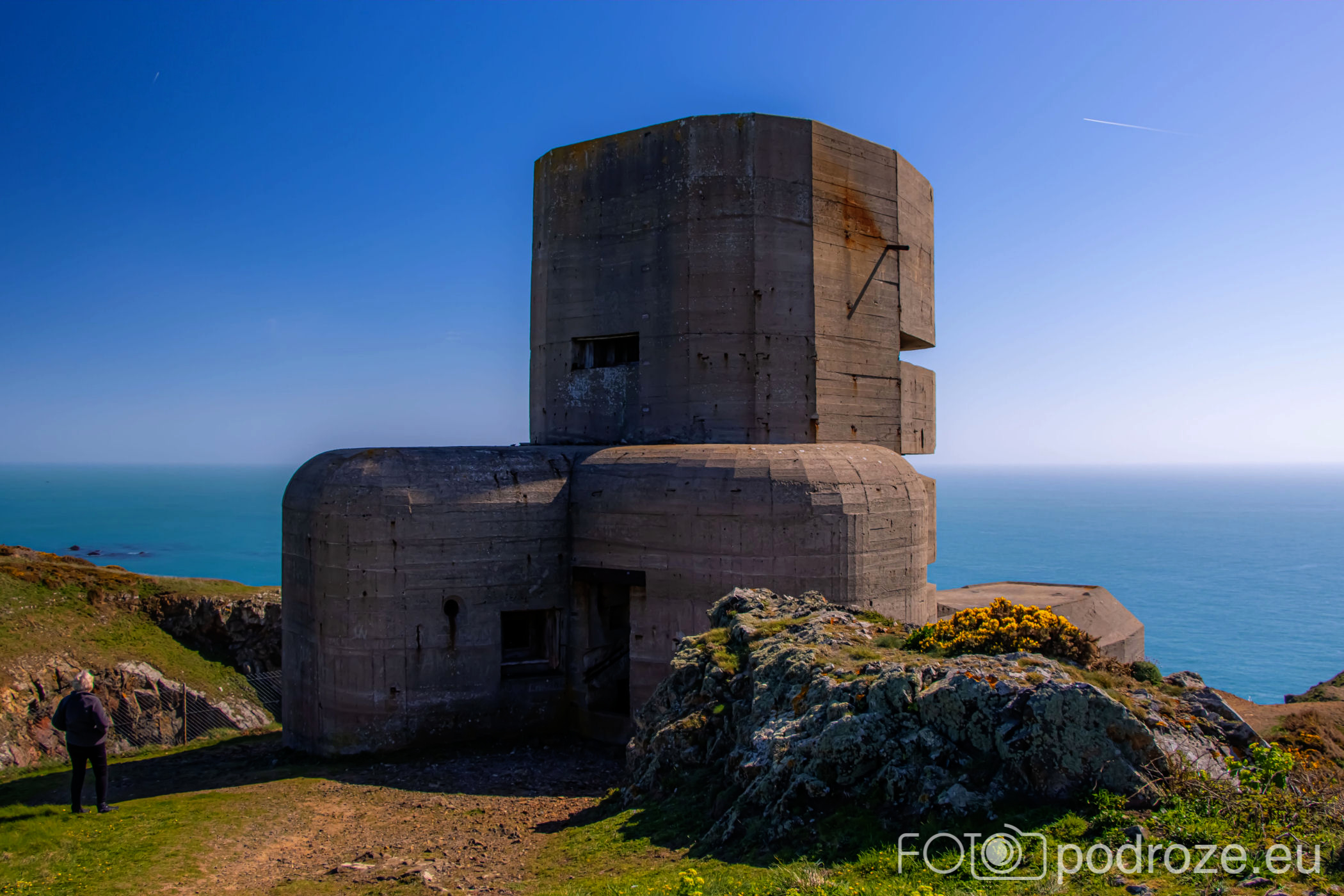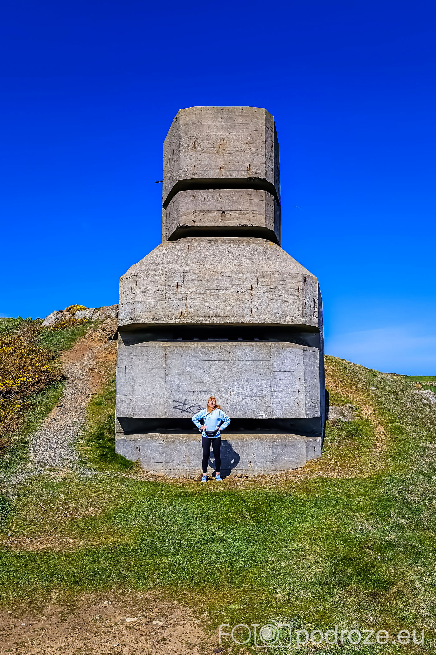 Dosłownie kilkaset metrów dalej mamy kolejny militarny obiekt, który warto obejrzeć z bliska. Wzniesiona w 1942 roku jako część systemu umocnień Hitlera, wieża MP4 była jednym z sześciu planowanych Marinepeilständen, czyli posterunków obserwacyjno‑zasięgowych, rozlokowanych na strategicznych punktach wysp Kanału, mających monitorować aktywność morską. Docelowo miały wspomagać baterie artylerii służące do obrony wyspy, jednak ze względu na trudności praktyczne realizację planu przerwano. Ukończono tylko pięć z jedenastu zaplanowanych wież. Każdy poziom wieży wyposażono w szczeliny obserwacyjne, umożliwiające kierowanie ogniem i pomiar odległości do celów morskich. Na dachu znajdowała się wieża radaru Freya, której pozostałości, czyli betonowy pierścień, przetrwały do dziś.