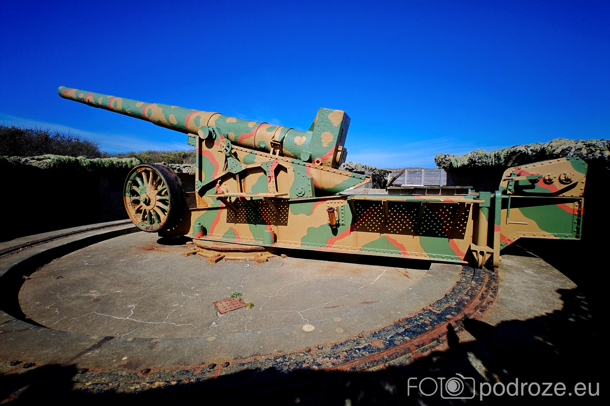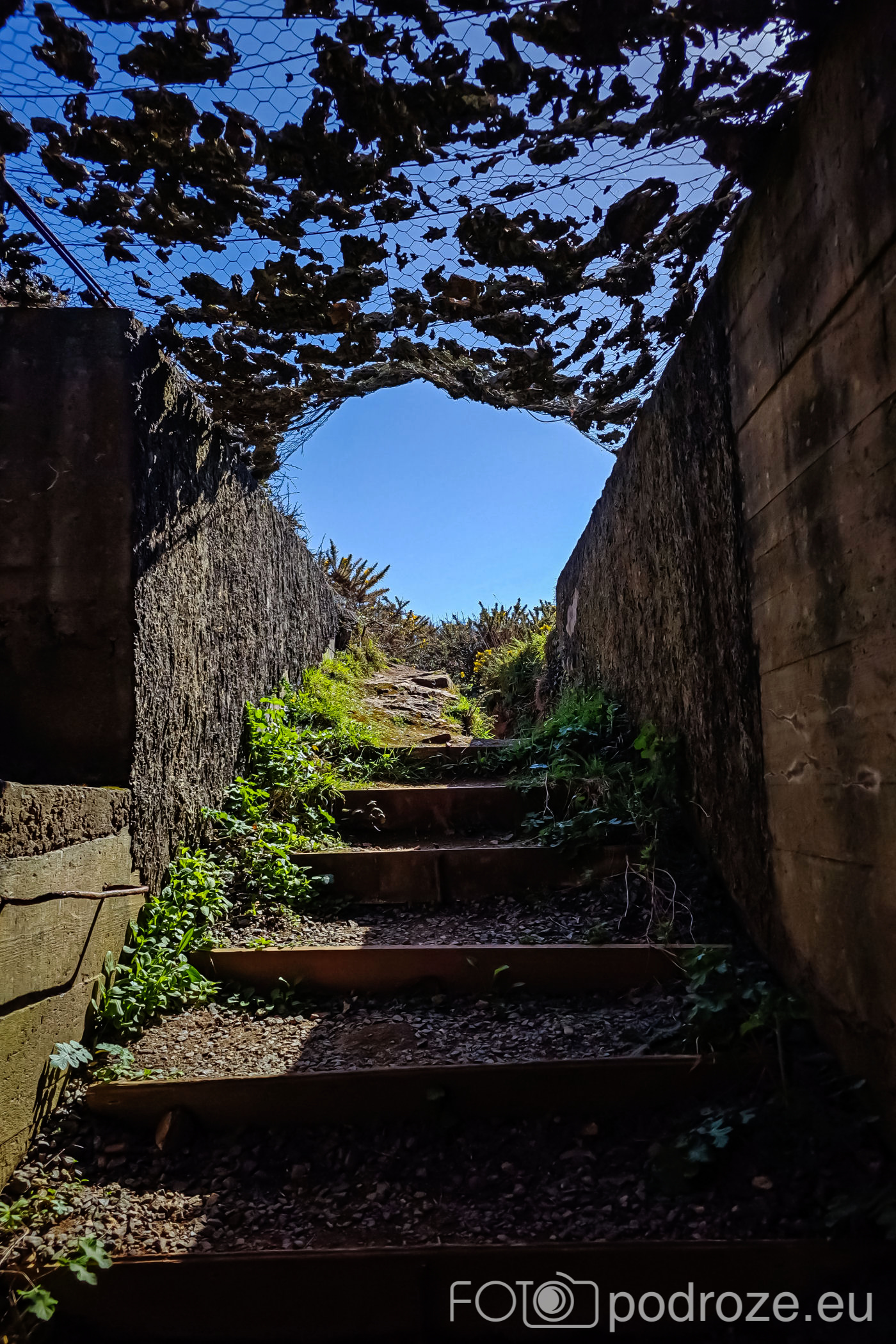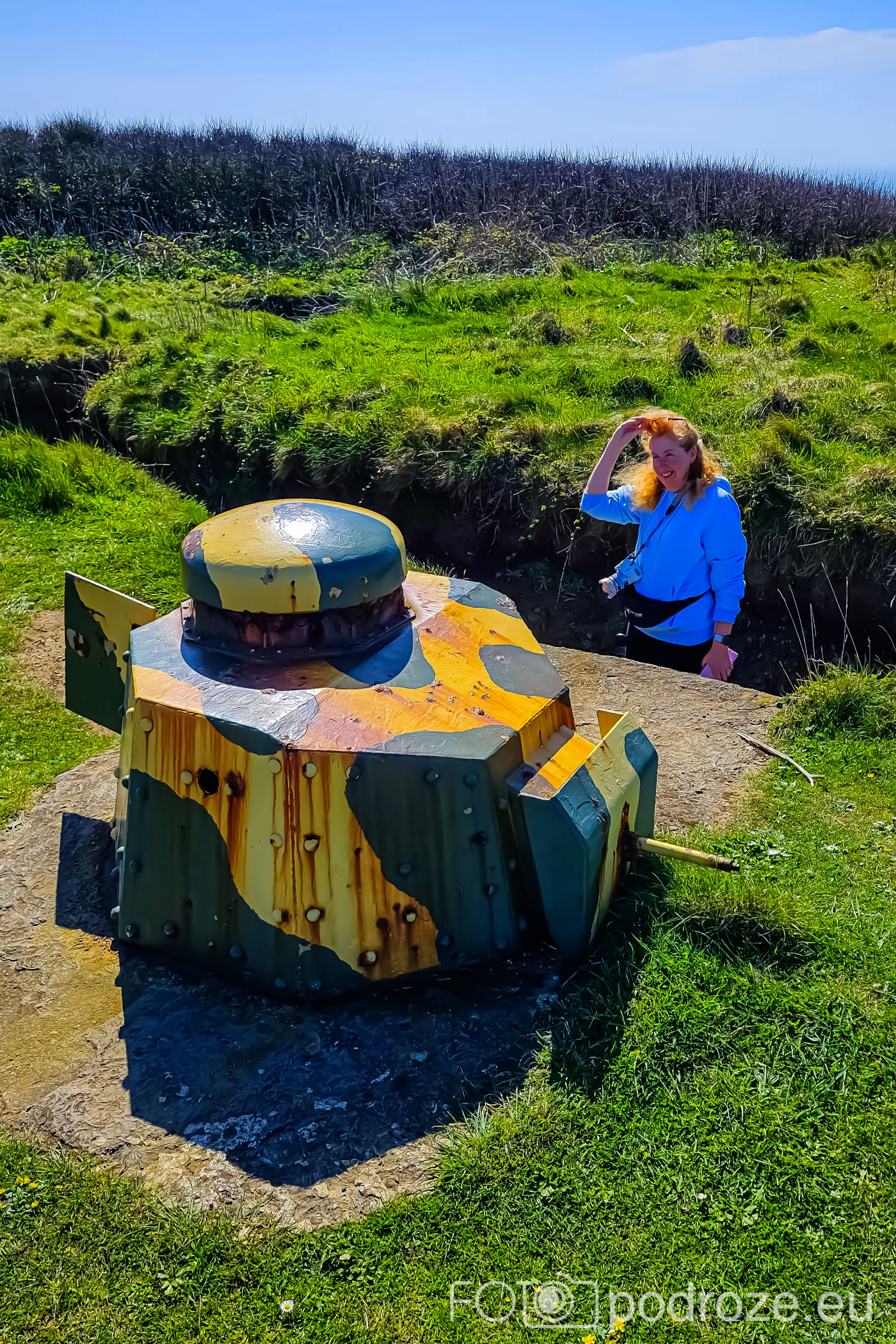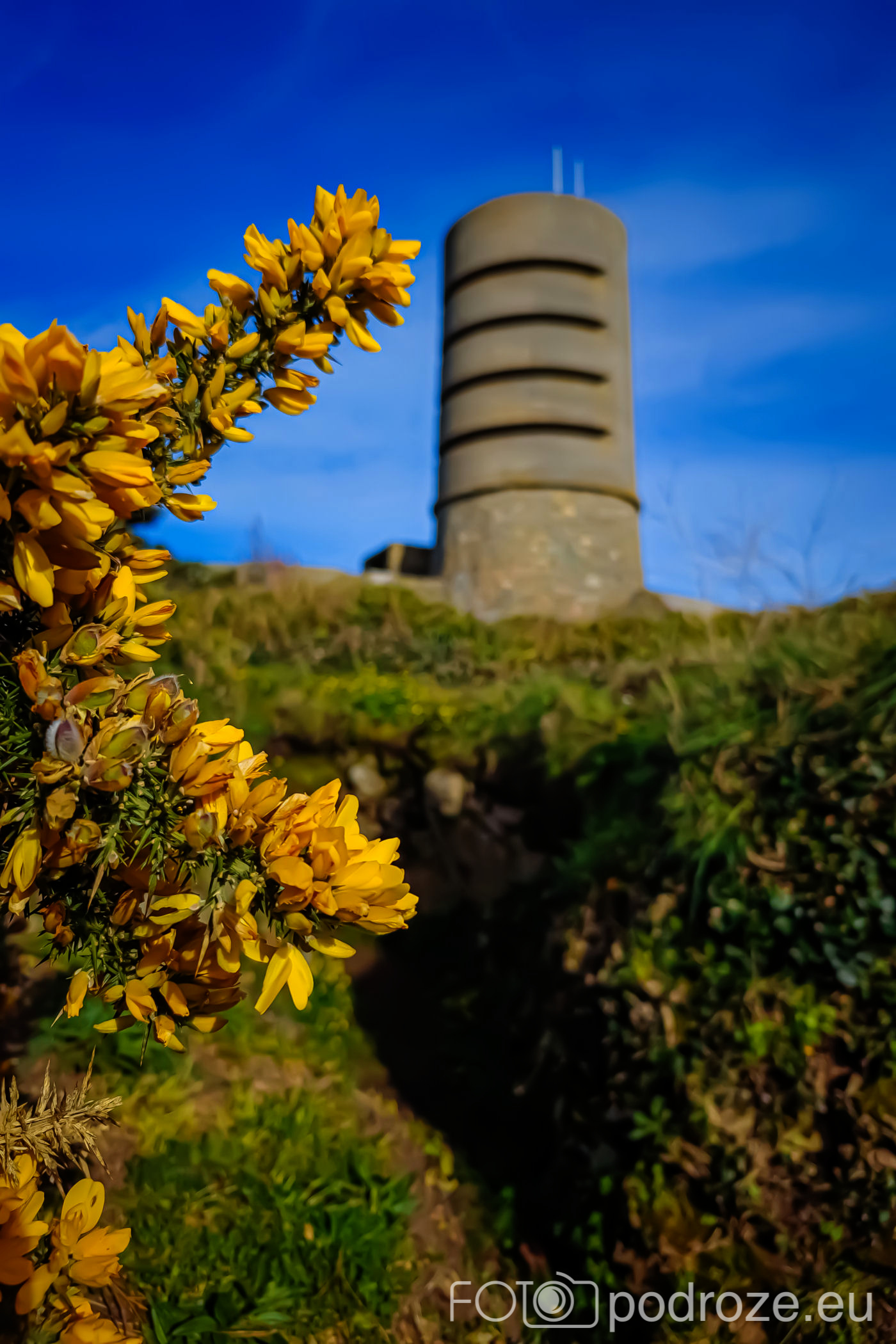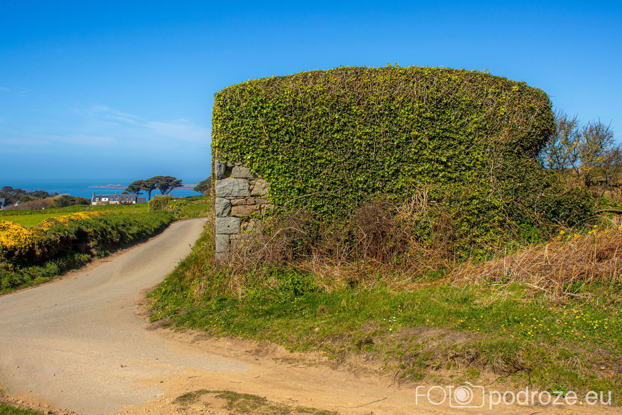Dosłownie kilkaset metrów dalej mamy kolejny militarny obiekt, który warto obejrzeć z bliska. Wzniesiona w 1942 roku jako część systemu umocnień Hitlera, wieża MP4 była jednym z sześciu planowanych Marinepeilständen, czyli posterunków obserwacyjno‑zasięgowych, rozlokowanych na strategicznych punktach wysp Kanału, mających monitorować aktywność morską. Docelowo miały wspomagać baterie artylerii służące do obrony wyspy, jednak ze względu na trudności praktyczne realizację planu przerwano. Ukończono tylko pięć z jedenastu zaplanowanych wież. Każdy poziom wieży wyposażono w szczeliny obserwacyjne, umożliwiające kierowanie ogniem i pomiar odległości do celów morskich. Na dachu znajdowała się wieża radaru Freya, której pozostałości, czyli betonowy pierścień, przetrwały do dziś.