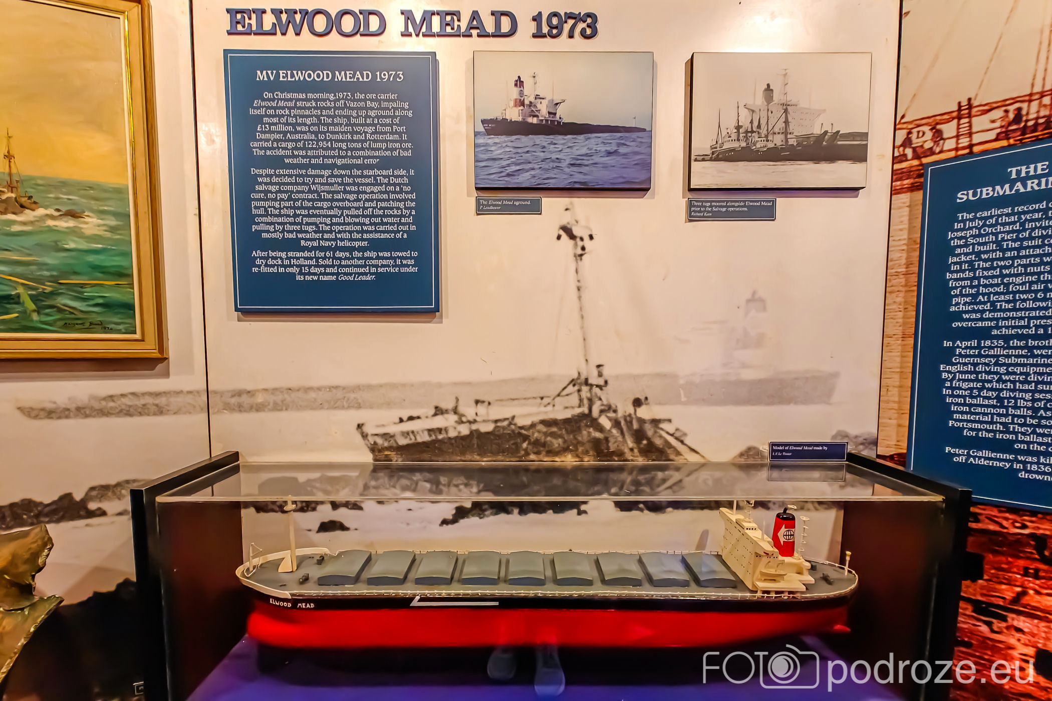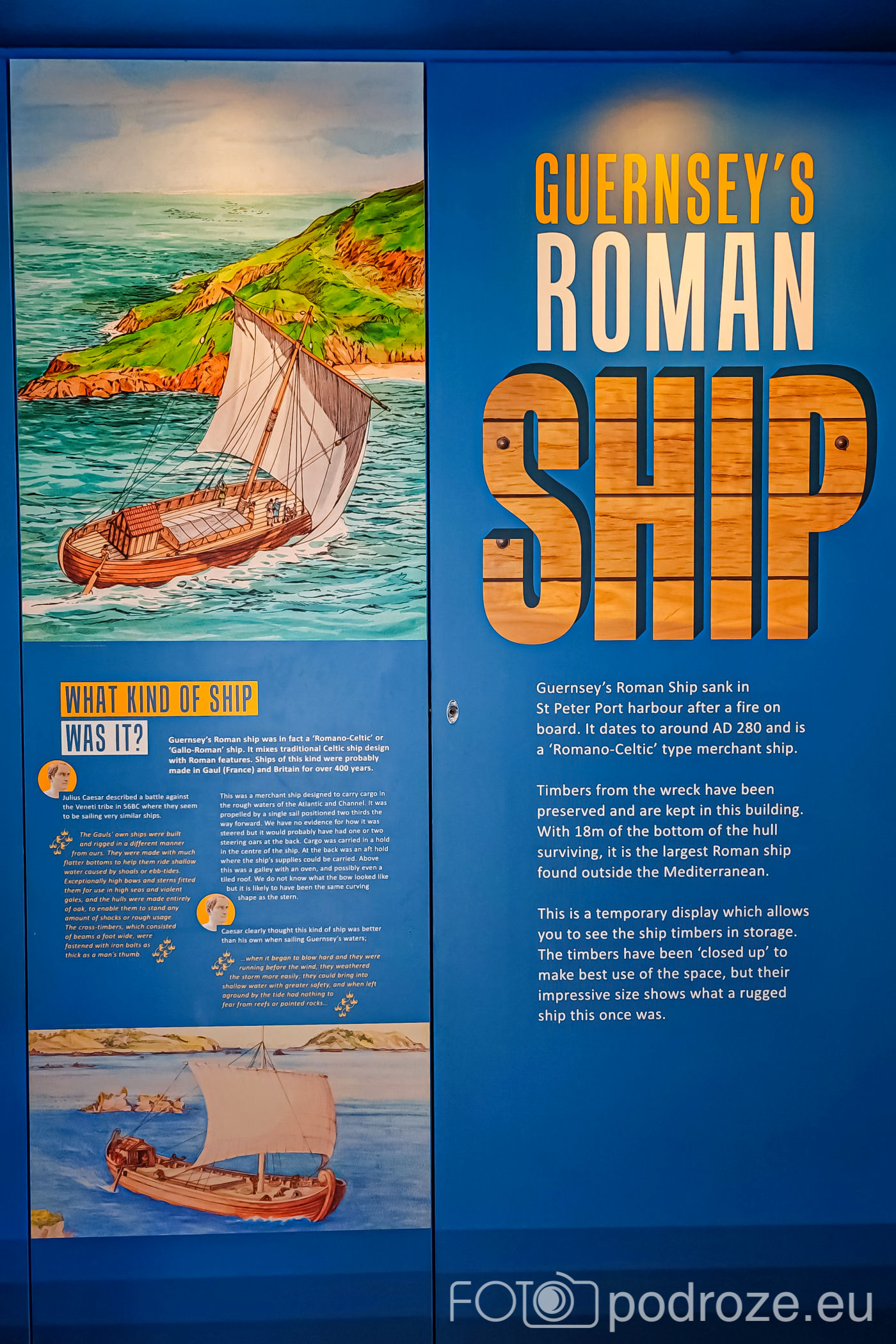 Tuż obok Guernsey Pearl, w budynku przystosowanym przez Guernsey Museums, wystawiono fragmenty wyjątkowego statku romano‑celtyckiego, który wpadł w ogień i zatonął około 280 roku. Odkryty został przypadkowo w porcie St Peter Port w Boże Narodzenie 1982 roku przez lokalnego nurka Richarda Keena. Zachowało się około 17 m z pierwotnych 22–25 m kadłuba. To największy znany statek tego typu znaleziony poza Morzem Śródziemnym. Zbudowano go w stylu galijsko‑celtyckim, przy użyciu ciężkich dębowych belek i grubych gwoździ, bez tradycyjnych połączeń. Statek przewoził ładunek smoły, która po zapaleniu go zniszczyła. Ciekawostką jest to, że smoła utopiła wiele artefaktów w twardą bryłę, co znacznie pomogło w konserwacji znaleziska .