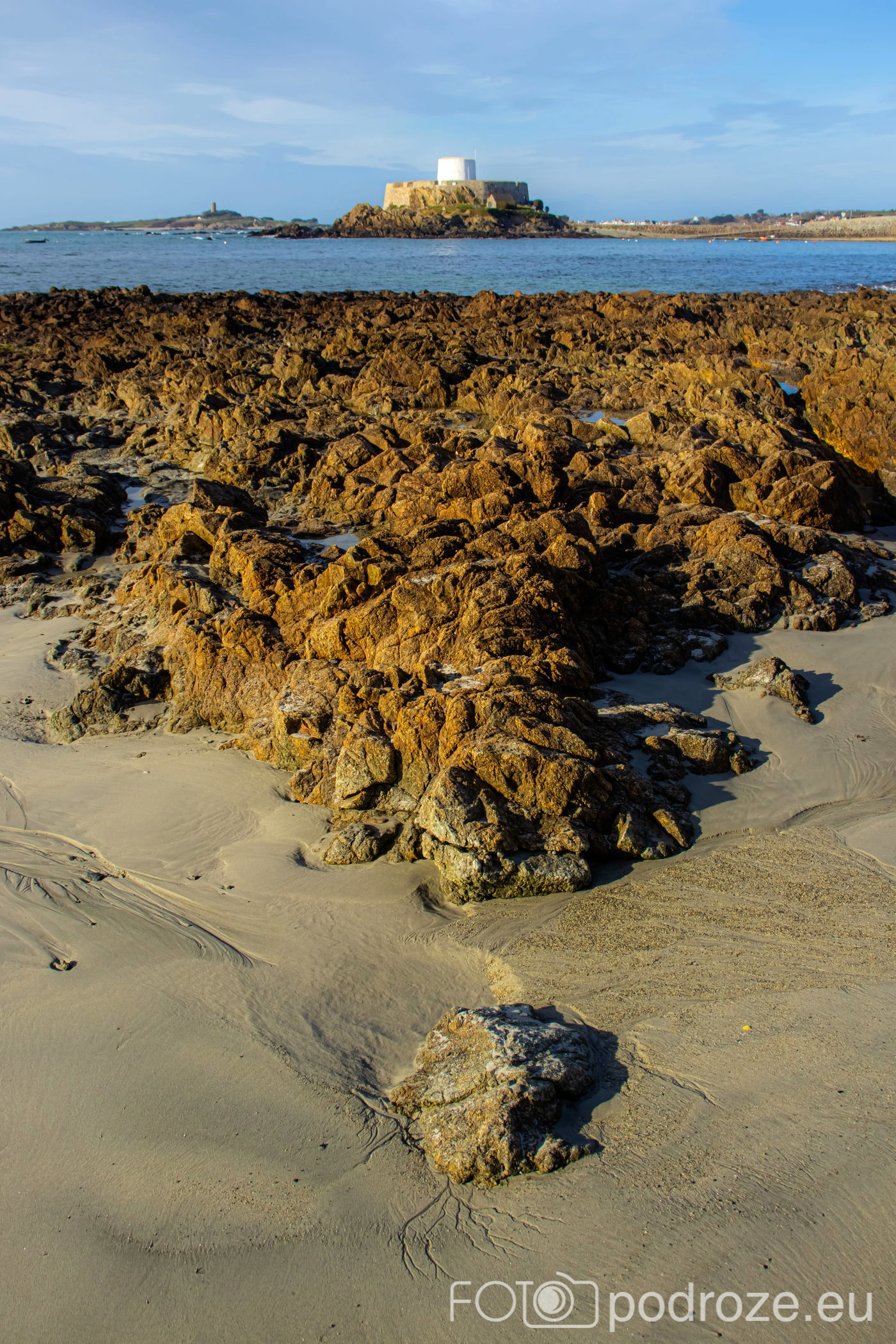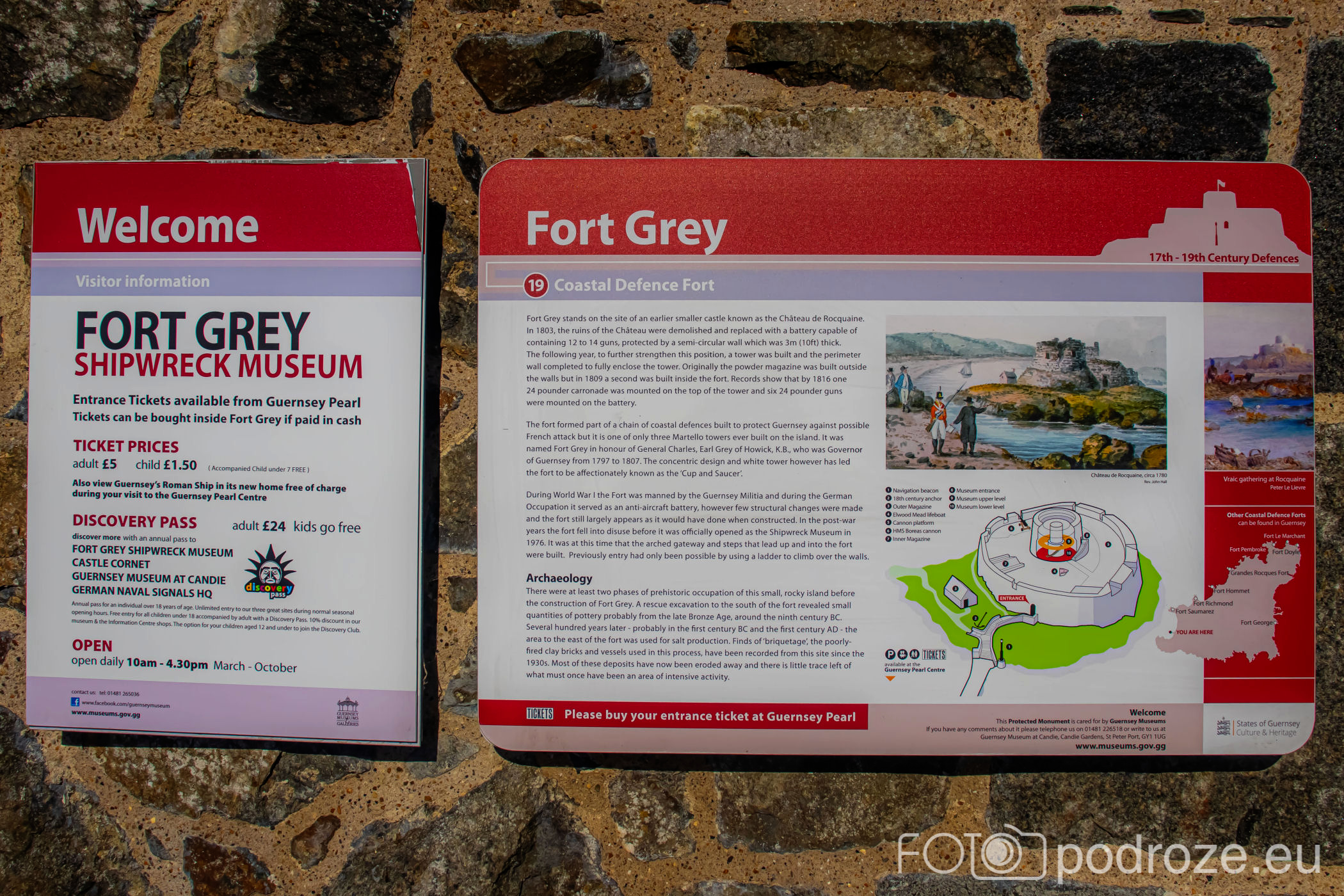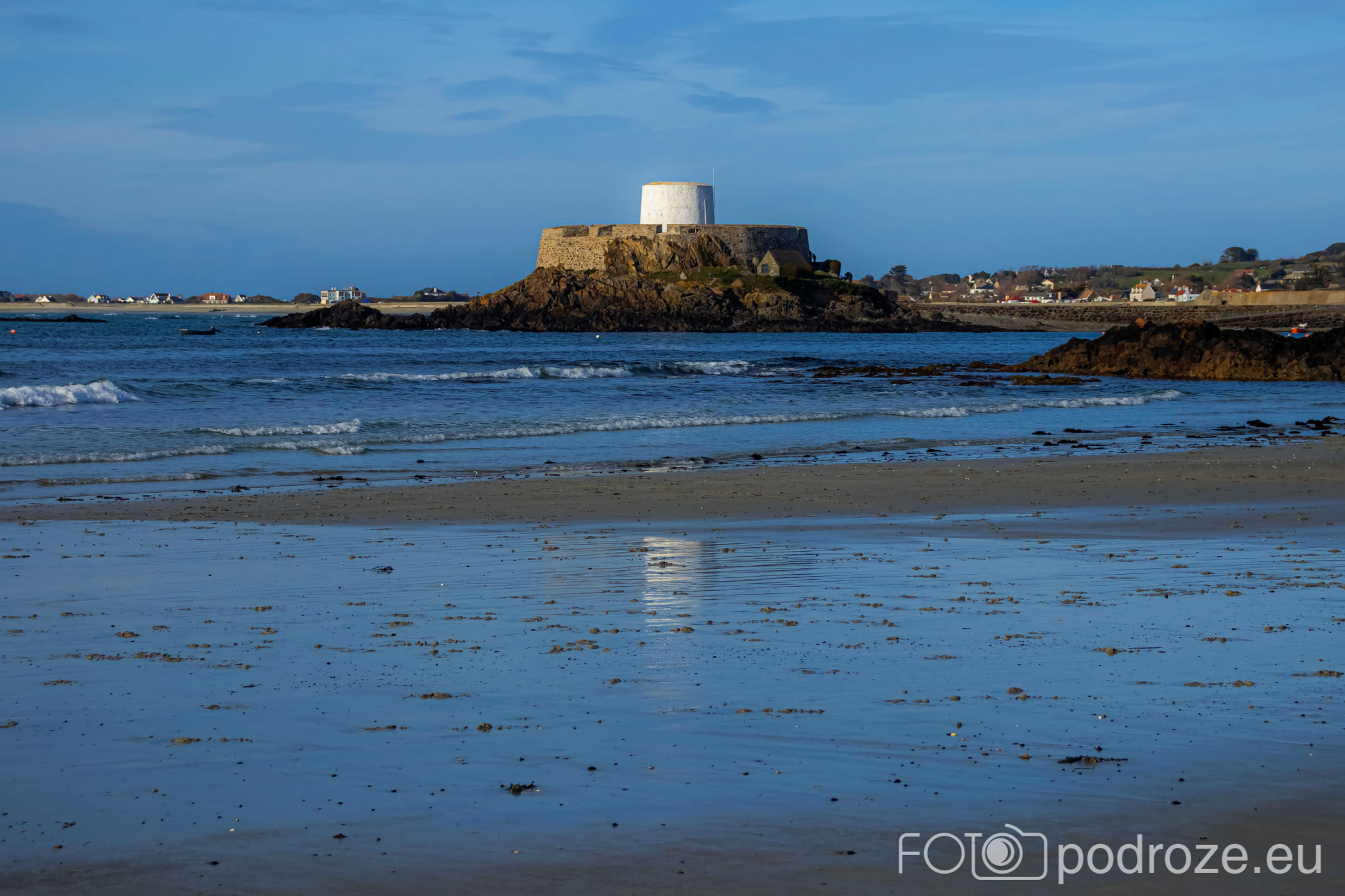 Fort Grey, znany również jako „Cup and Saucer” ze względu na swój charakterystyczny kształt, to jeden z najbardziej fotogenicznych zabytków Guernsey. Szczególnie oglądany z plaży Rocquaine Bay, która rozciąga się u jego stóp. Z tej piaszczysto-żwirowej plaży rozciąga się panoramiczny widok na fort, samotnie stojący na skalistej wysepce tuż przy brzegu. Podczas odpływu można niemal podejść suchą stopą pod sam mur, a przy przypływie otaczające go wody mienią się w słońcu, tworząc pocztówkowy krajobraz.