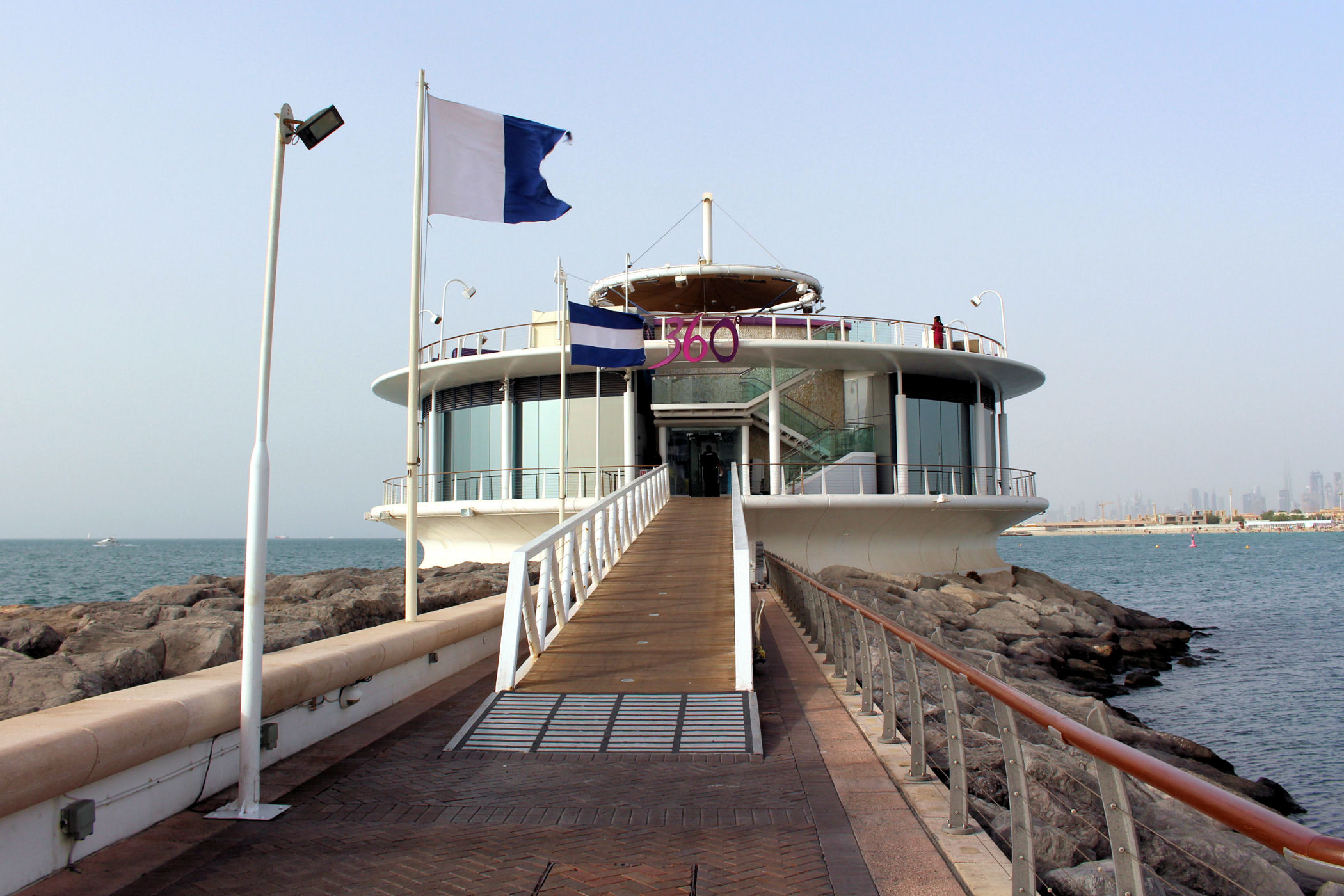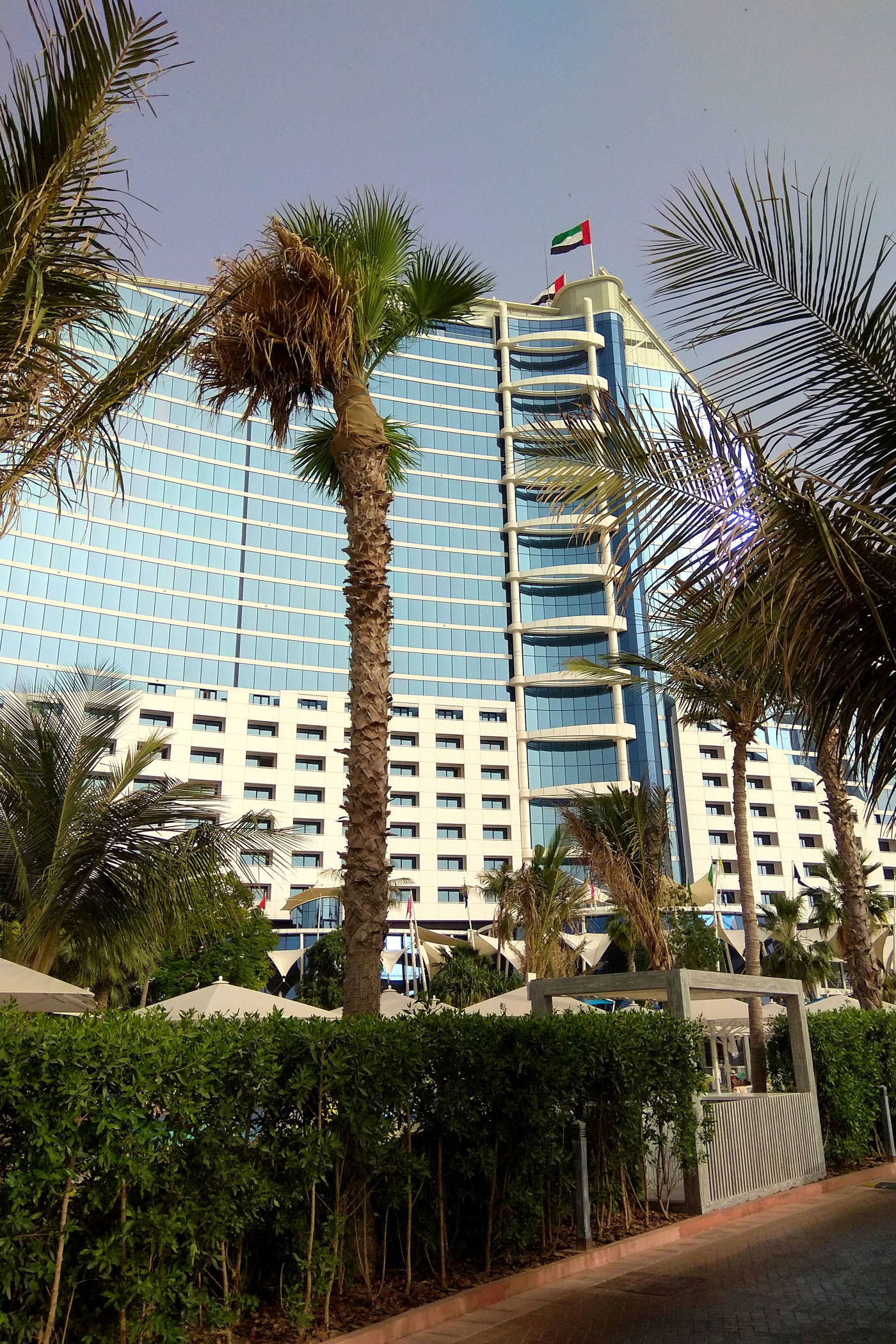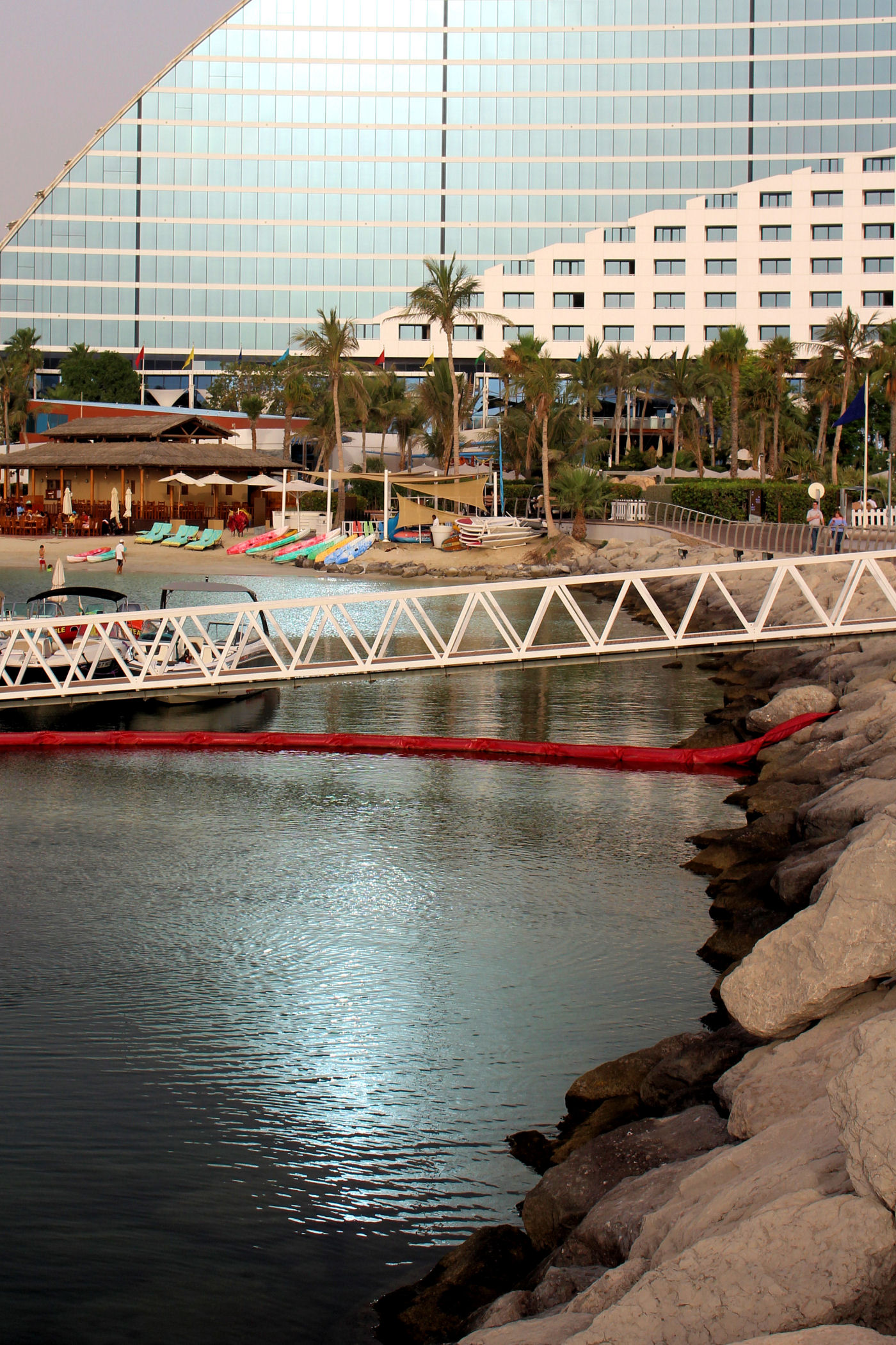 Ten luksusowy hotel położony jest nad prywatną, 900-metrową plażą. Jego architektura inspirowana jest kształtem fal morskich i stanowi niejako tło dla naszej perełki od strony wody. Posiadają ponoć wspaniały wystrój wnętrz nawiązujący do głównych żywiołów: ziemi, wody, wiatru i ognia. My przechodzimy przez teren hotelu, aby dostać się do baru 360 znajdującego się na końcu promenady.