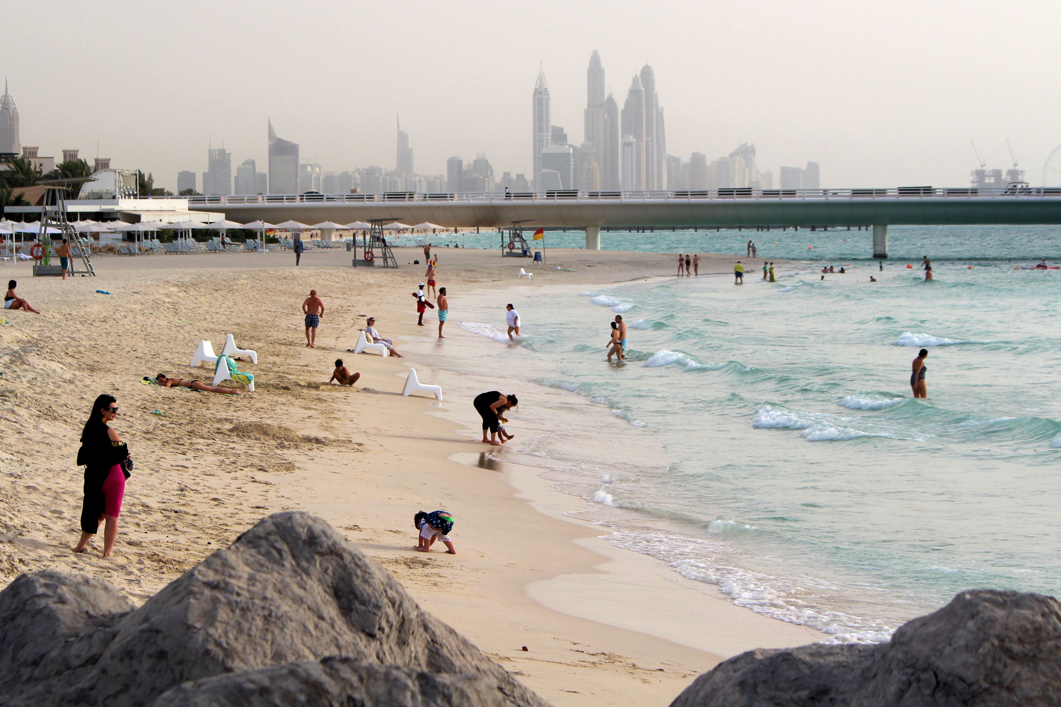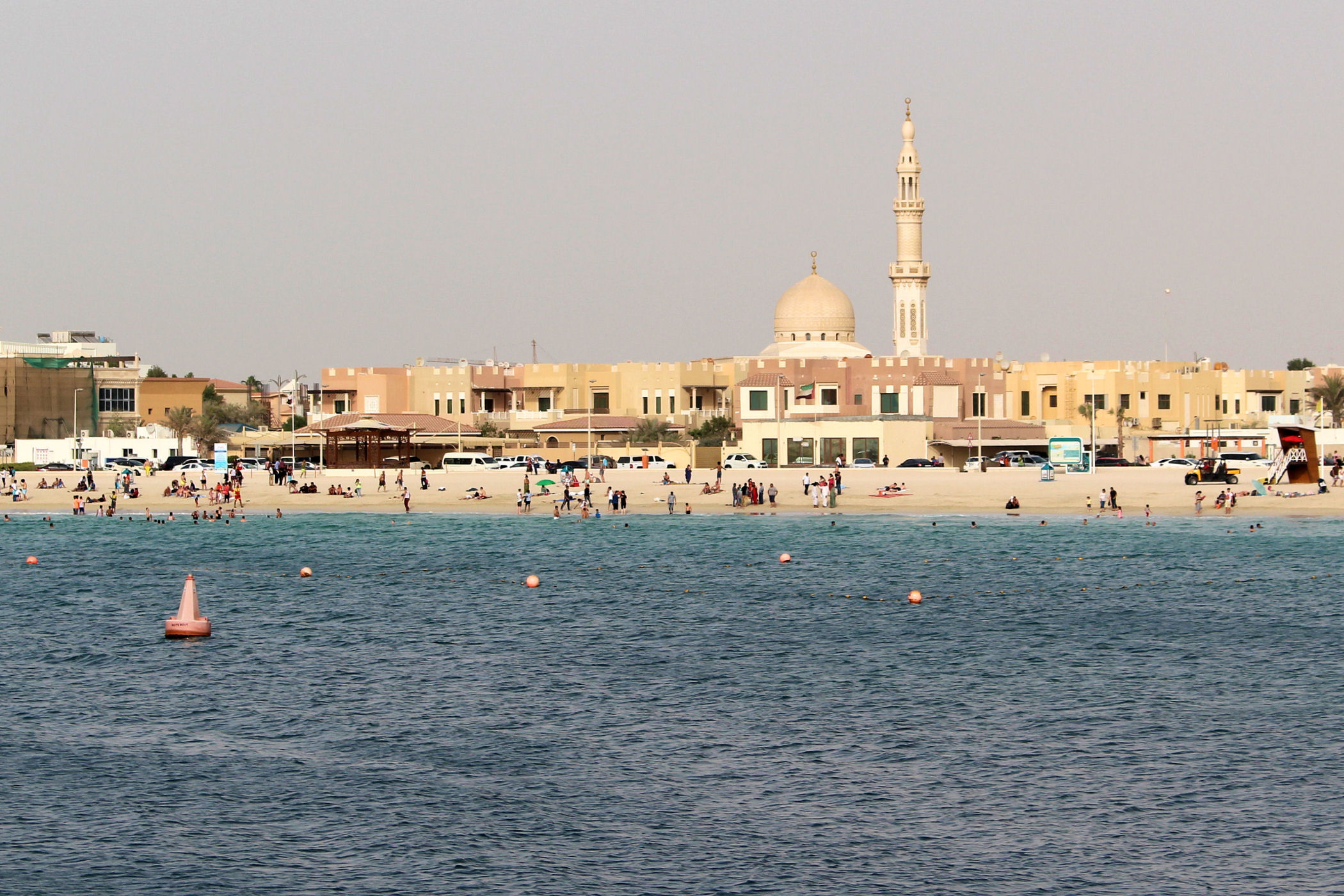 Poniżej galeria plaż i obiektów, które widać w najbliższej okolicy obu hoteli oraz z promenady i baru 360. Mamy tu więc plaże publiczną, a za nią Meczet Wojownika. Kawałek dalej znajduje się Dubai Public Library Humaid al tayer Mosque z 2 minaretami. W oddali widać stąd najwyższy budynek świata ( na tą chwilę) Burj Khalifa.