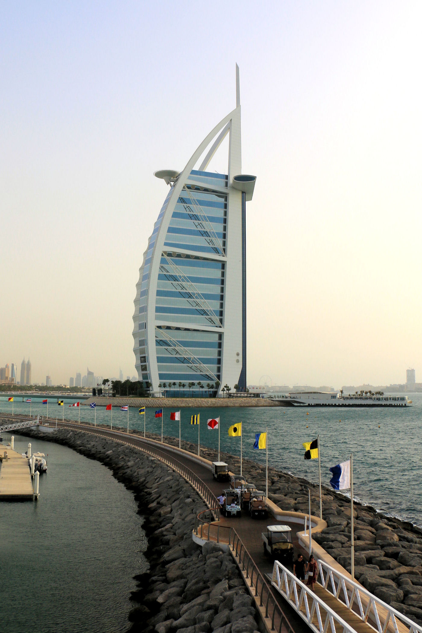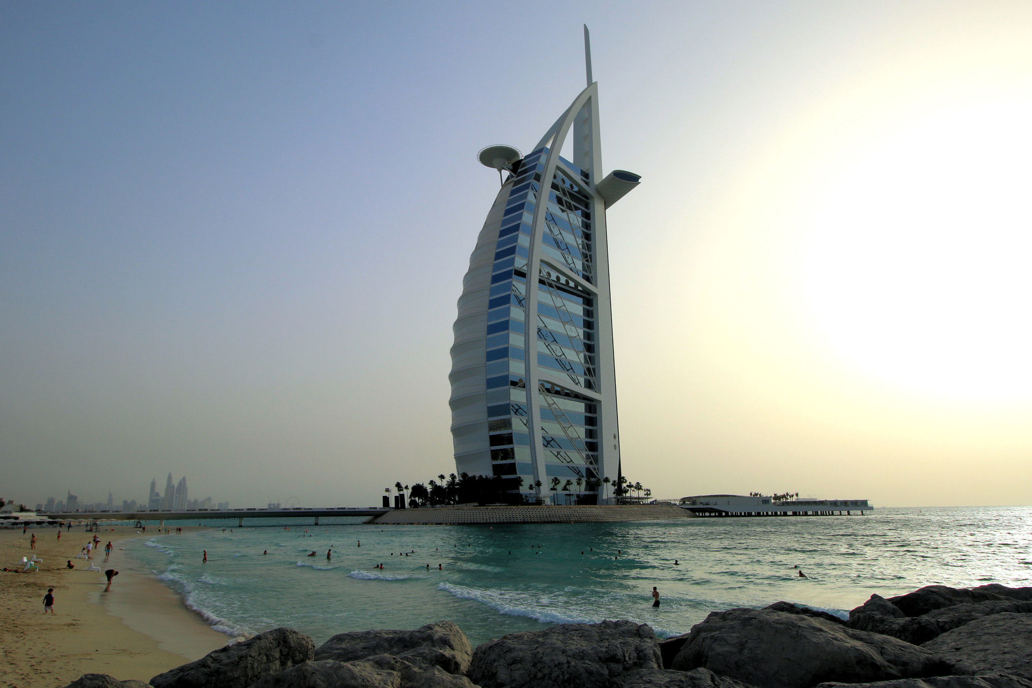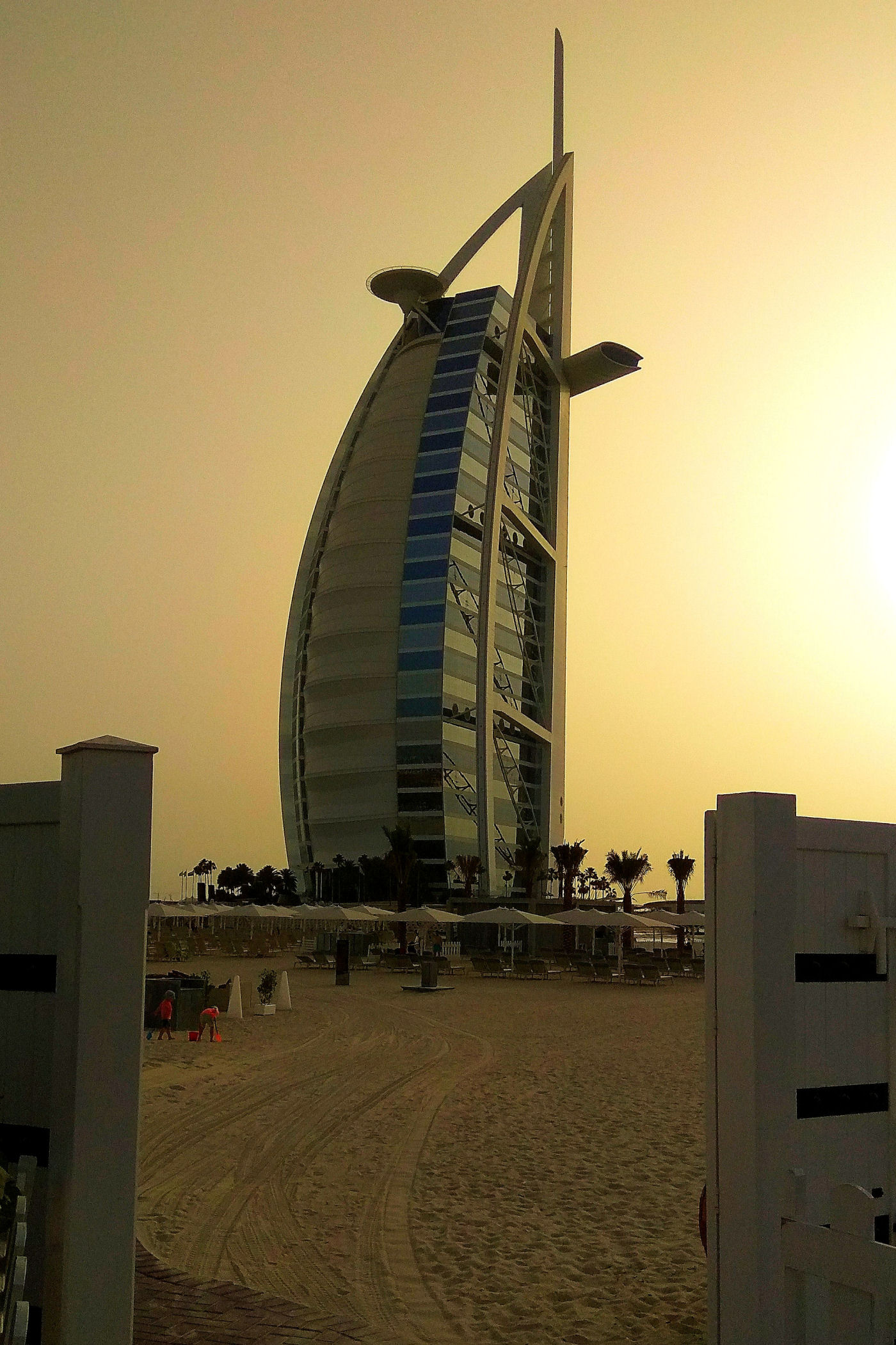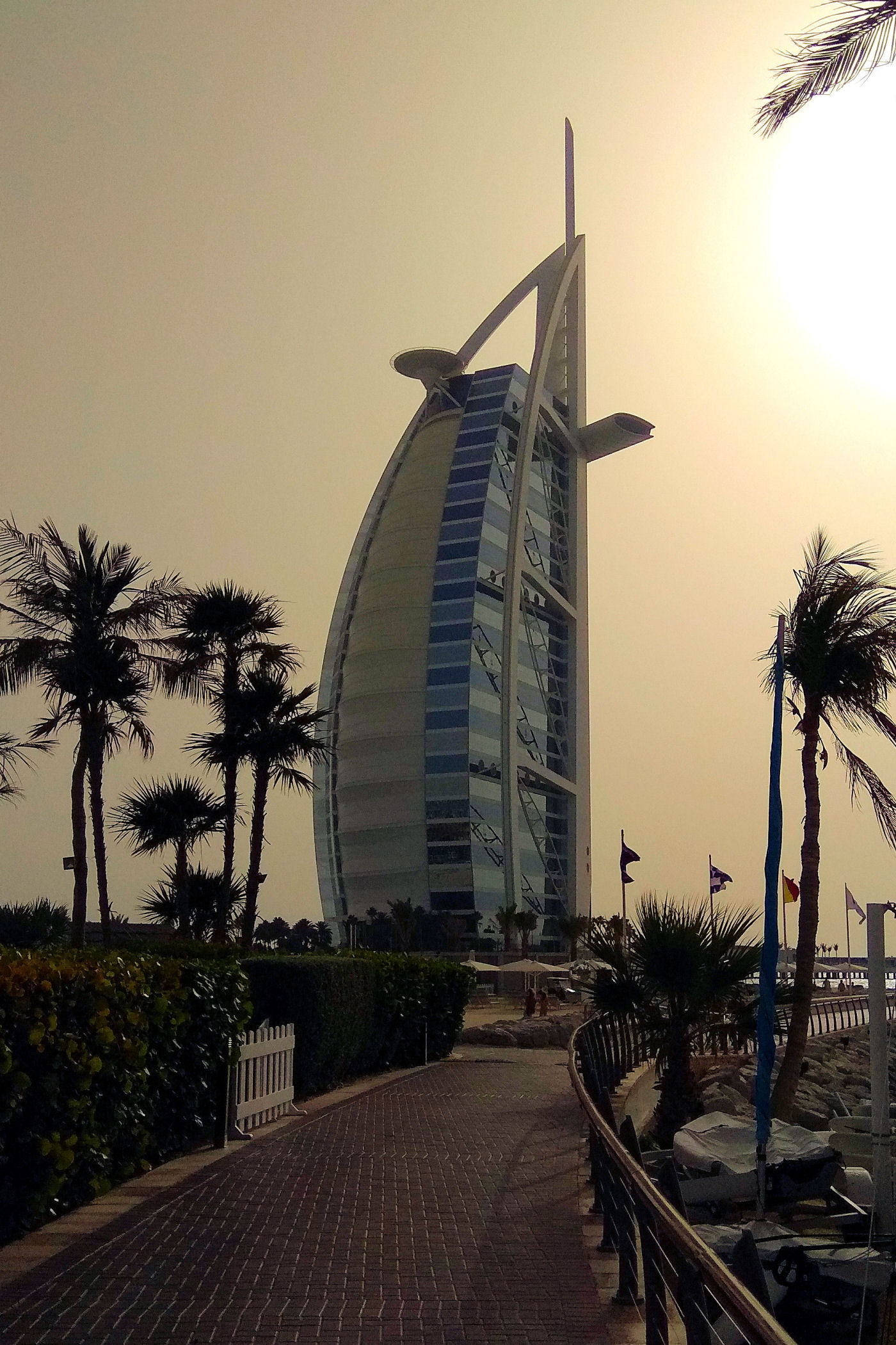 Burj Al Arab zajmował czołową pozycję na naszej liście marzeń. Po prostu chcieliśmy zobaczyć ten najpiękniejszy budynek świata. Czy taki jest, trudno powiedzieć, ale z pewnością nadal zachwyca. Wybraliśmy się, aby go obejrzeć późnym popołudniem licząc na spektakularny zachód słońca. Niestety przejrzystość powietrza w Dubaju zdarza się niezbyt często, efekt był taki sobie, o wiele ciekawiej wyglądał o tej porze dnia II hotel w tym kompleksie – Jumeirah Beach.