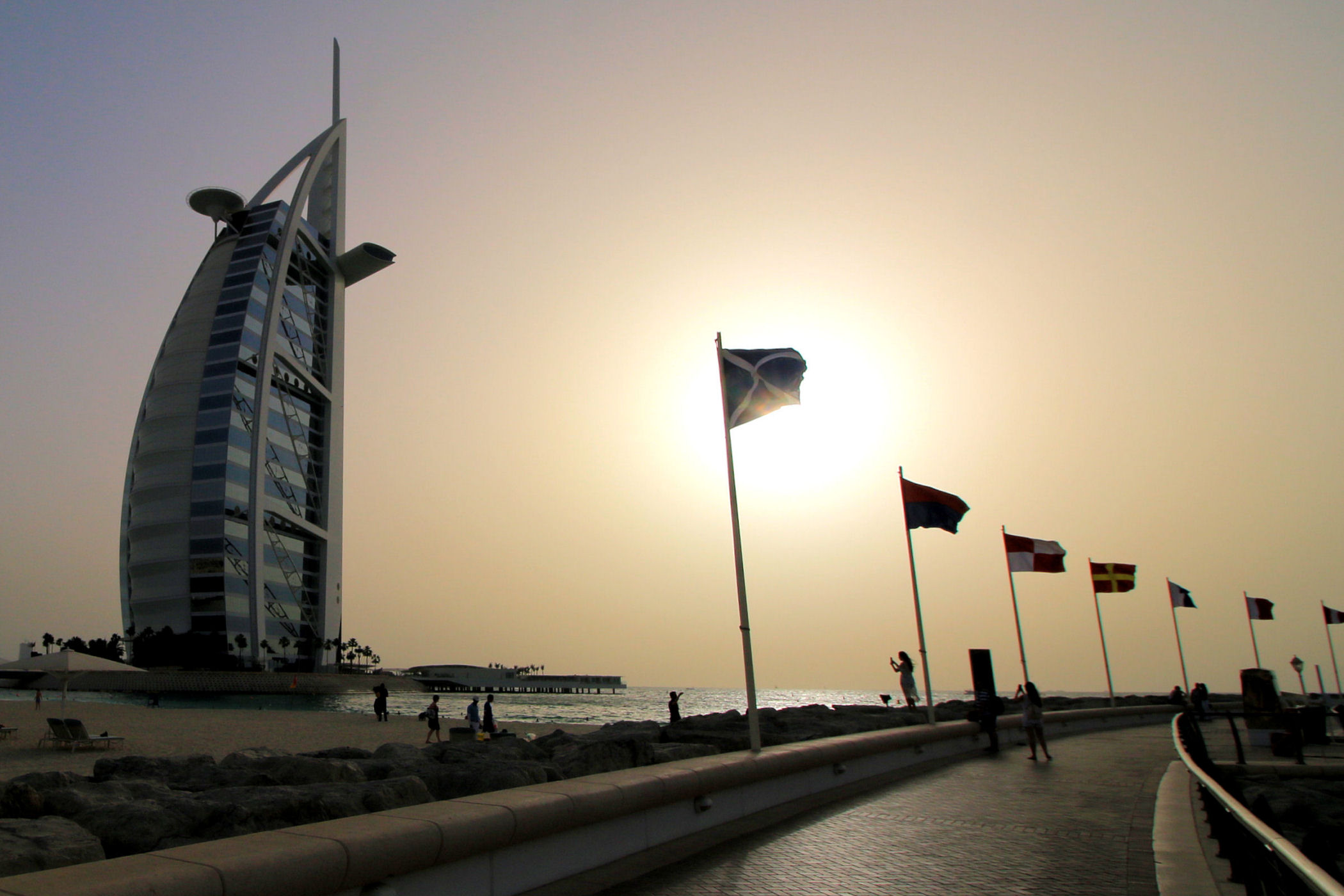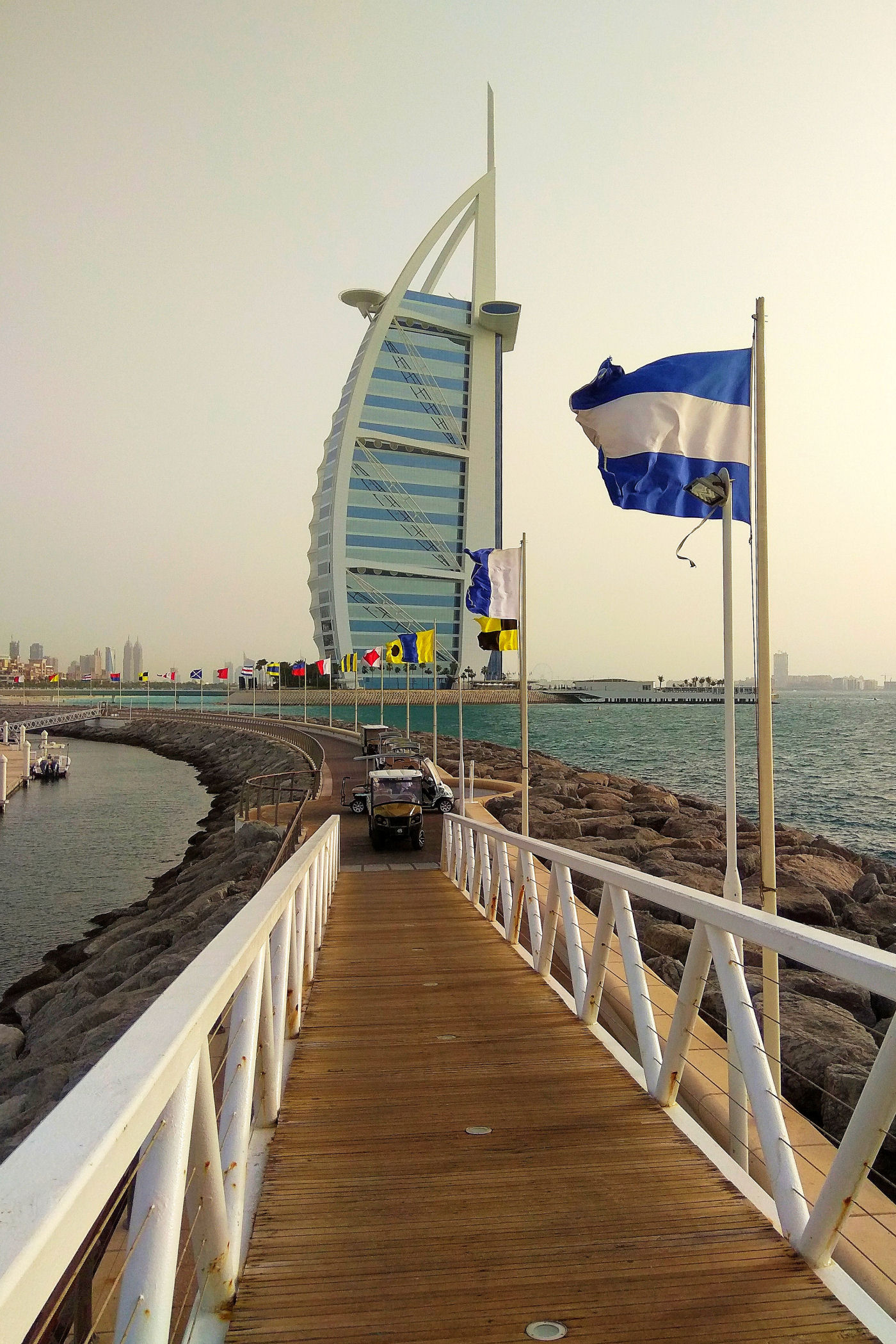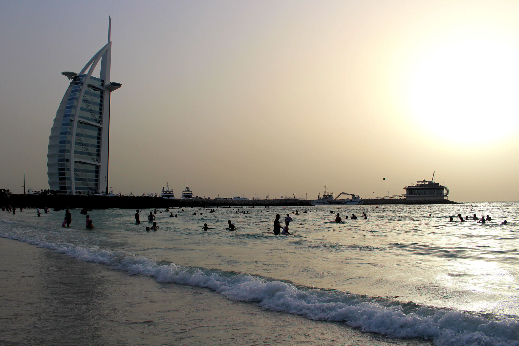 Burj Al Arab zajmował czołową pozycję na naszej liście marzeń. Po prostu chcieliśmy zobaczyć ten najpiękniejszy budynek świata. Czy taki jest, trudno powiedzieć, ale z pewnością nadal zachwyca. Wybraliśmy się, aby go obejrzeć późnym popołudniem licząc na spektakularny zachód słońca. Niestety przejrzystość powietrza w Dubaju zdarza się niezbyt często, efekt był taki sobie, o wiele ciekawiej wyglądał o tej porze dnia II hotel w tym kompleksie – Jumeirah Beach.