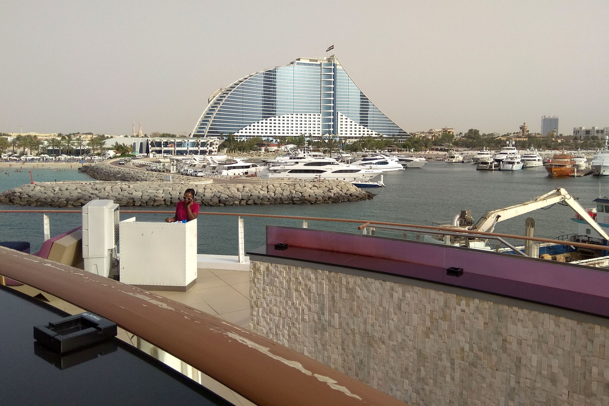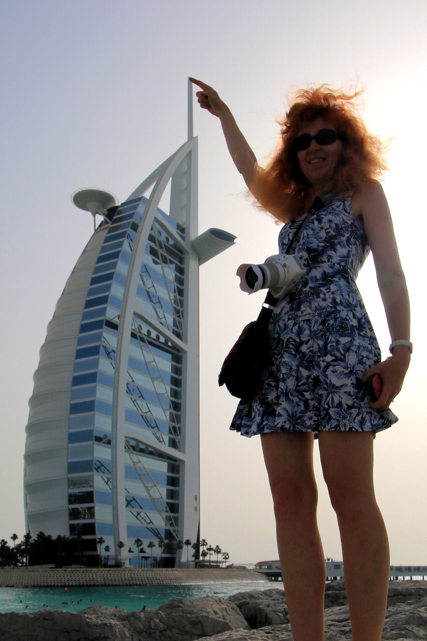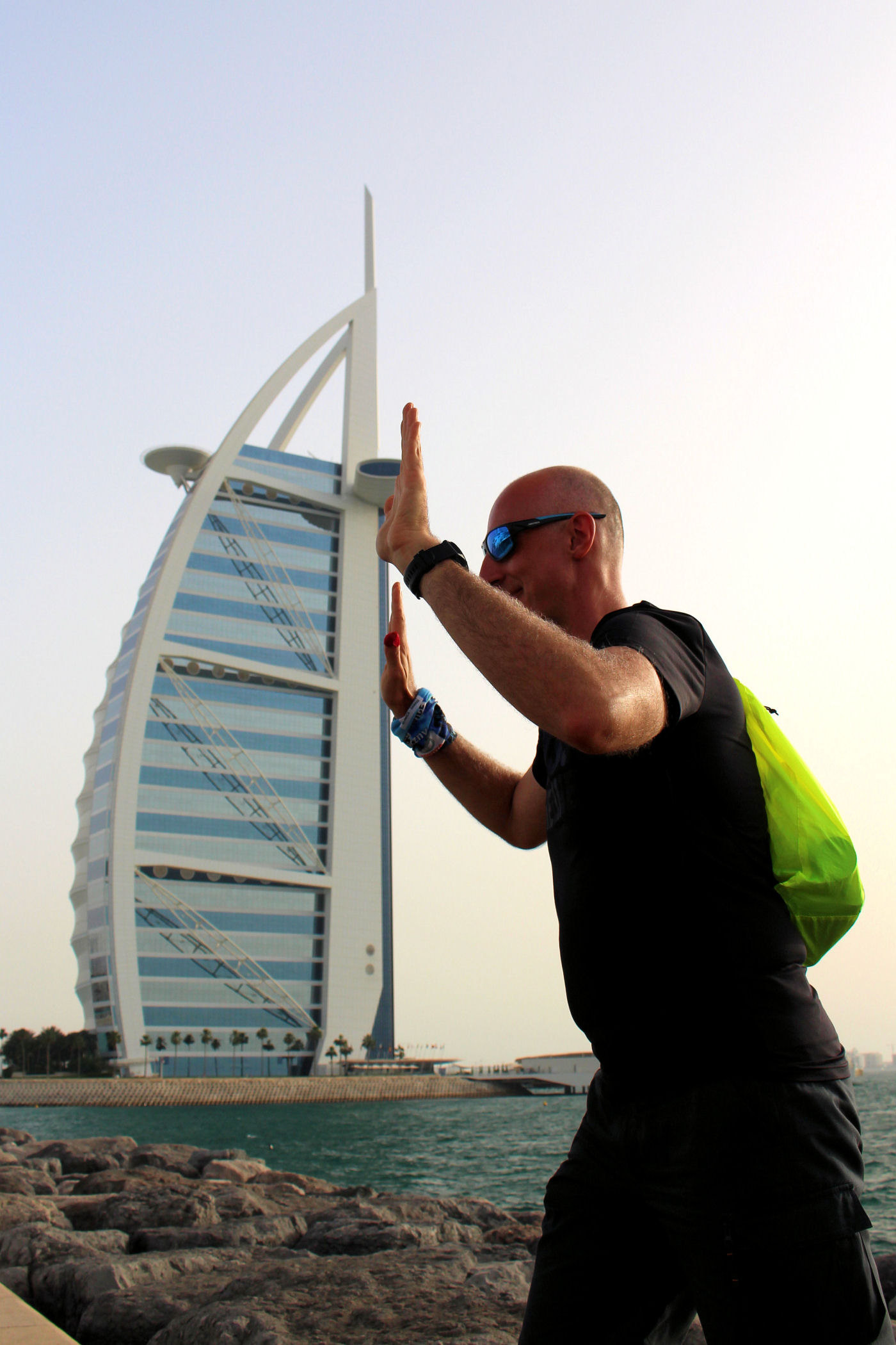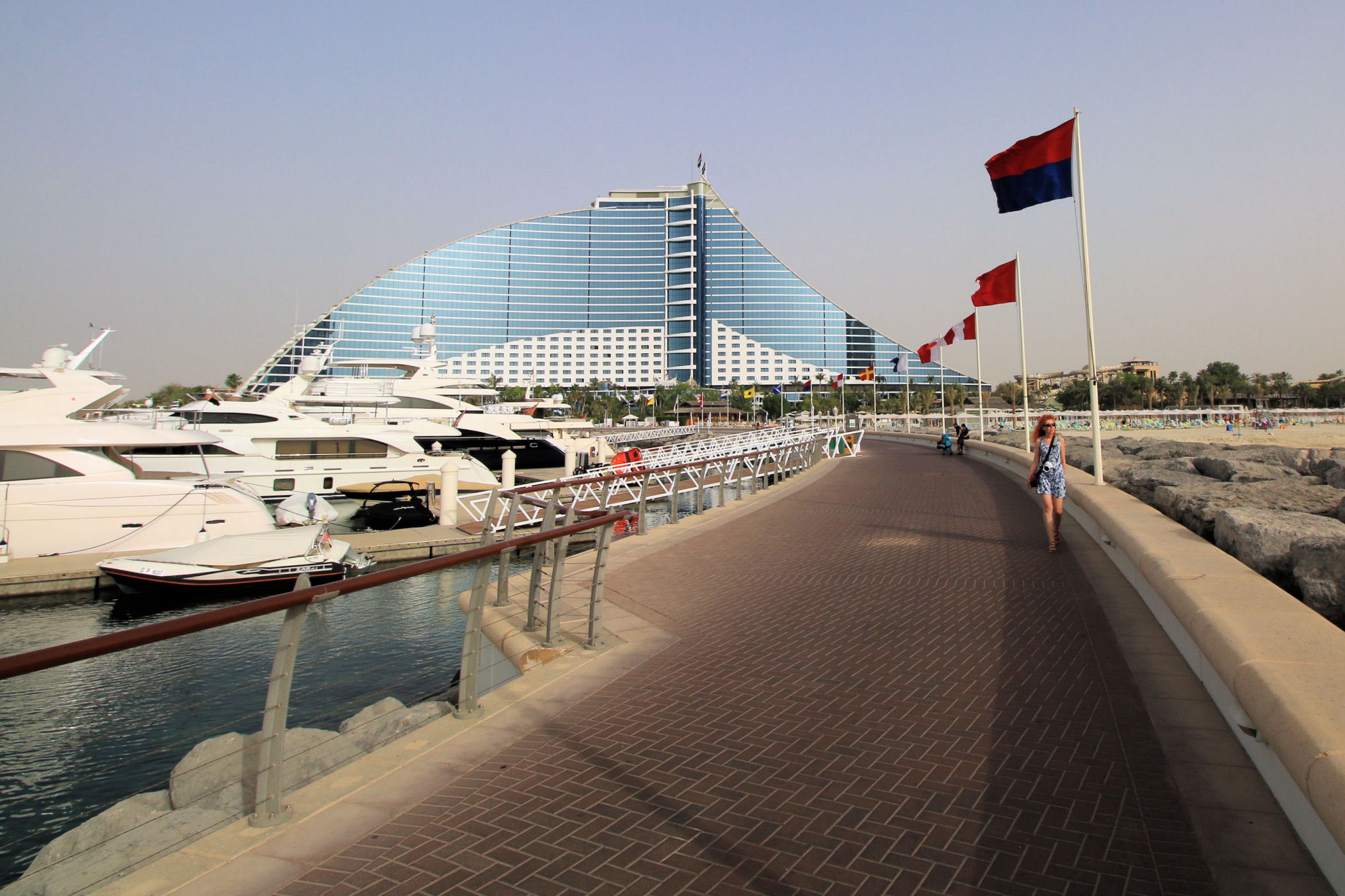 Burj Al Arab zajmował czołową pozycję na naszej liście marzeń. Po prostu chcieliśmy zobaczyć ten najpiękniejszy budynek świata. Czy taki jest, trudno powiedzieć, ale z pewnością nadal zachwyca. Wybraliśmy się, aby go obejrzeć późnym popołudniem licząc na spektakularny zachód słońca. Niestety przejrzystość powietrza w Dubaju zdarza się niezbyt często, efekt był taki sobie, o wiele ciekawiej wyglądał o tej porze dnia II hotel w tym kompleksie – Jumeirah Beach.