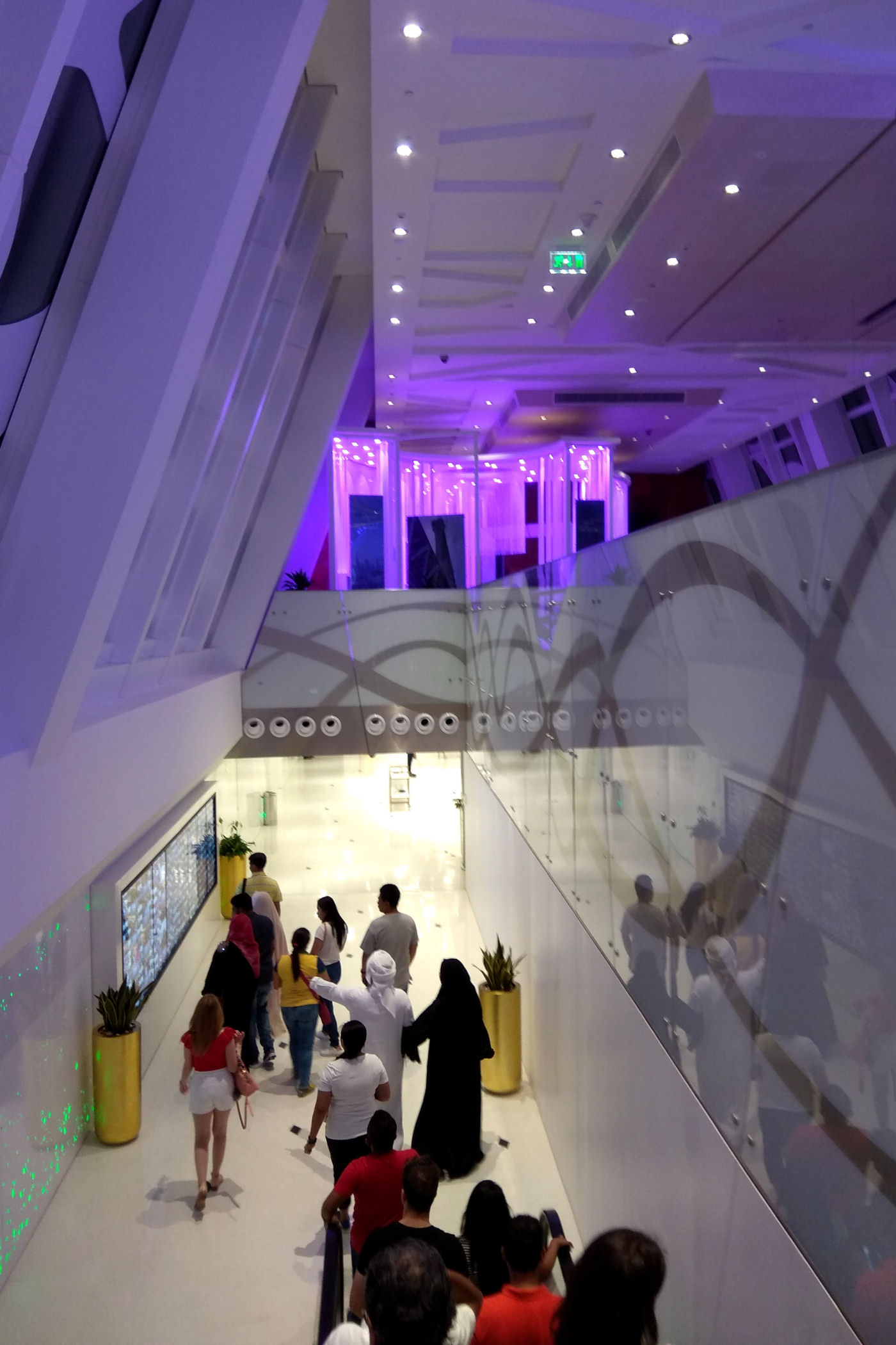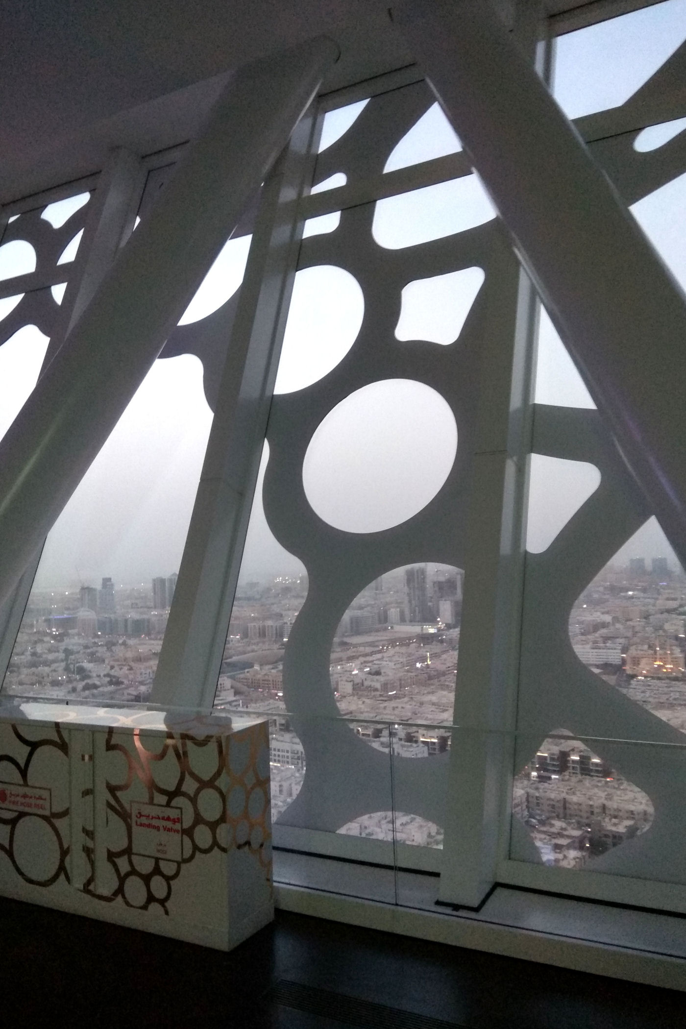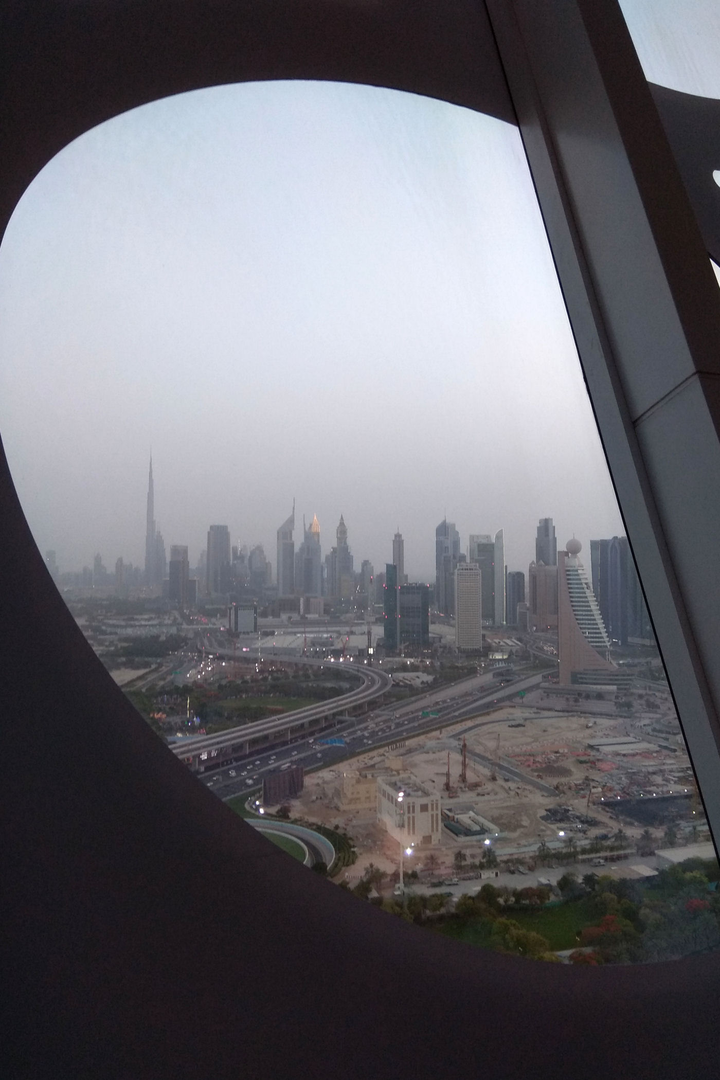 Zanim wjedziemy na górę, czeka nas wizyta w galerii. Mijamy kolejno projekcje i prezentacje audio-wizualne przedstawiające niezbyt długą historię miasta, ale jakże dynamiczną. Potem szybka winda zawozi nas na najwyższy poziom. Dubai Frame pozwala podziwiać wszystkie dzielnice miasta z wysokości 150 metrowego tarasu widokowego. Taras to górna część ramy, gdzie znajduje się nowoczesny szklany 93-metrowy szklany most. Stąd widać Dubaj w całej okazałości. My niestety ponownie liczymy na spektakularny zachód słońca i ponownie się rozczarowujemy, na horyzoncie jest bowiem szara masa, a miasto też nie wygląda najciekawiej, bo o tej porze jest jeszcze nieoświetlone. Na zakończenie wizyty we wnętrzach RAMY, czeka nas jeszcze symulacja „Wirtualna Metropolia”, która przedstawia w rzeczywistości wirtualnej ewolucję Dubaju i wizje Szejka dotyczące jego przyszłości.