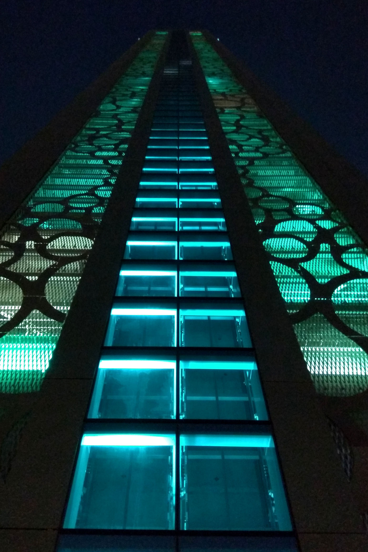 Kiedy kończymy wizytę we wnętrzach ramy zapada zmrok, a cały obiekt oraz otoczenie okazuje się pięknie podświetlone.