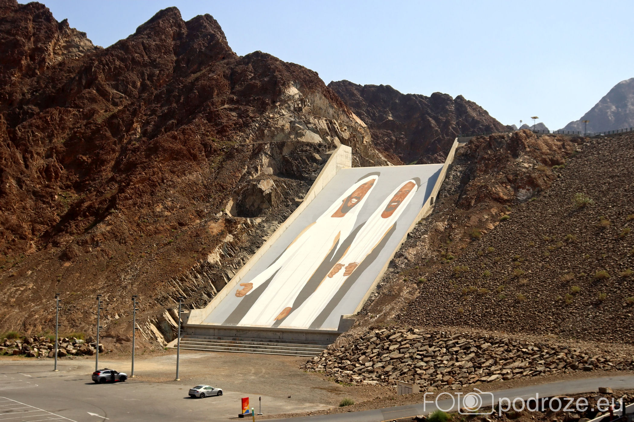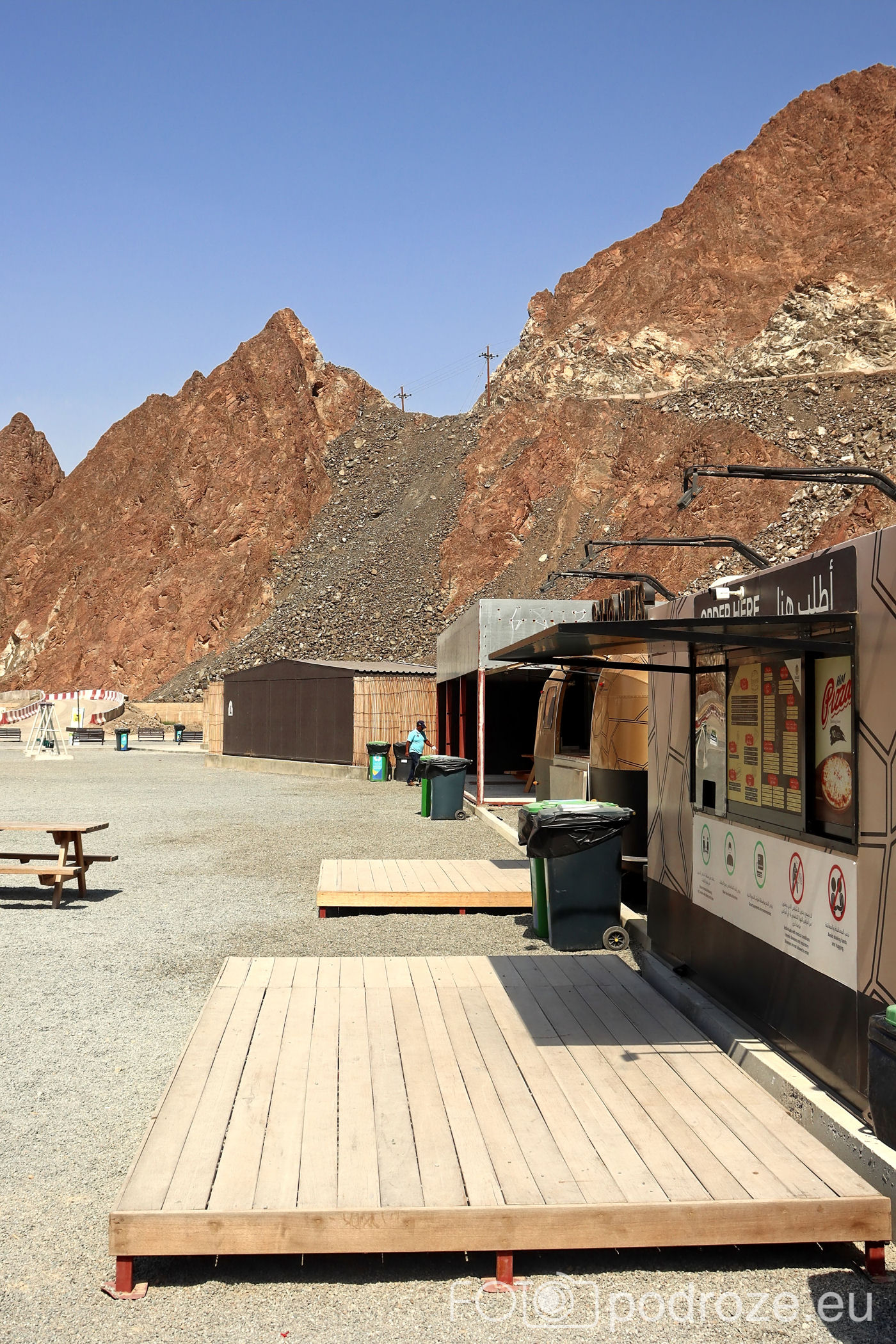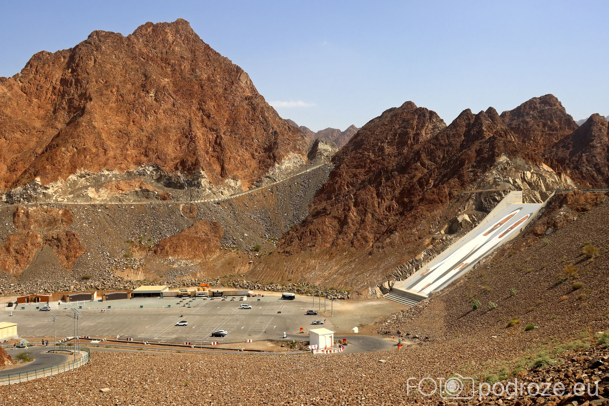 Ogromny parking umiejscowiony jest pod zaporą. Jeśli kiedykolwiek miało by tu dojść do zrzutu wody, to całość była by zalana. Dla na – ludzi z kraju w którym bywają powodzie – to dość zaskakujące rozwiązanie. Miejsce na zrzut wody ma ciekawe malowidło z szejkami. Sam parking posiada infrastrukturę , są tu toalety, a przede wszystkich kilka obiektów gastronomicznych i dużo stolików. Wypijamy więc kawę i wędrujemy do góry na zaporę.