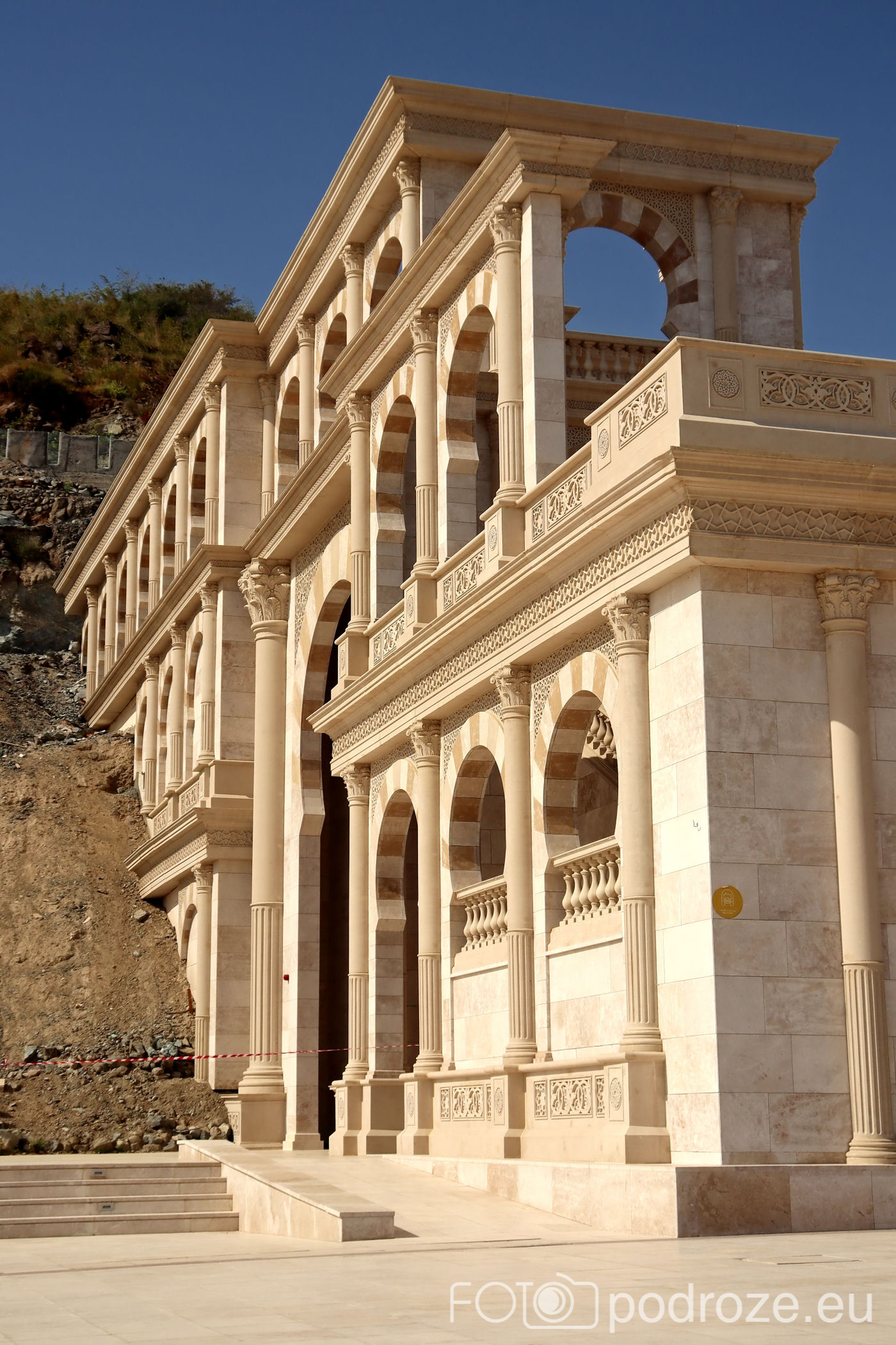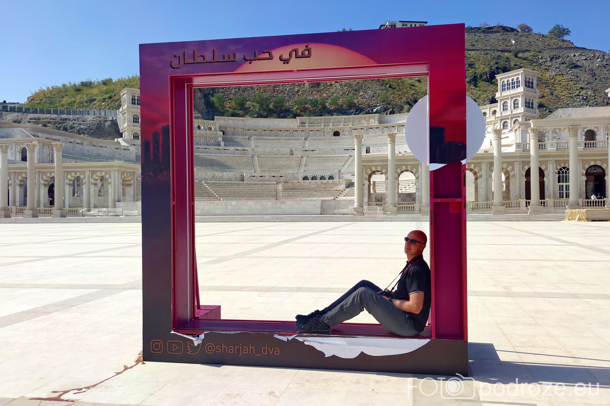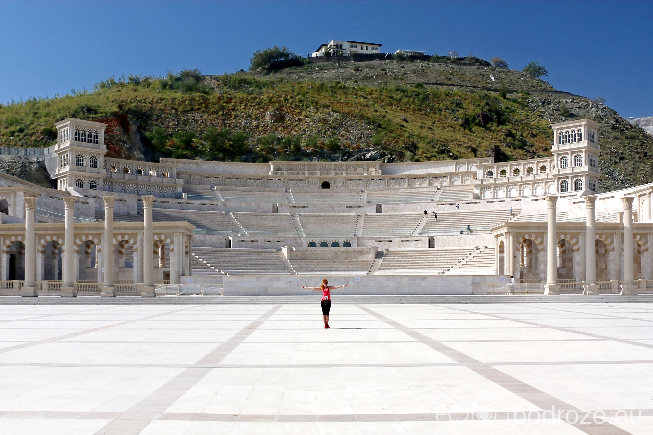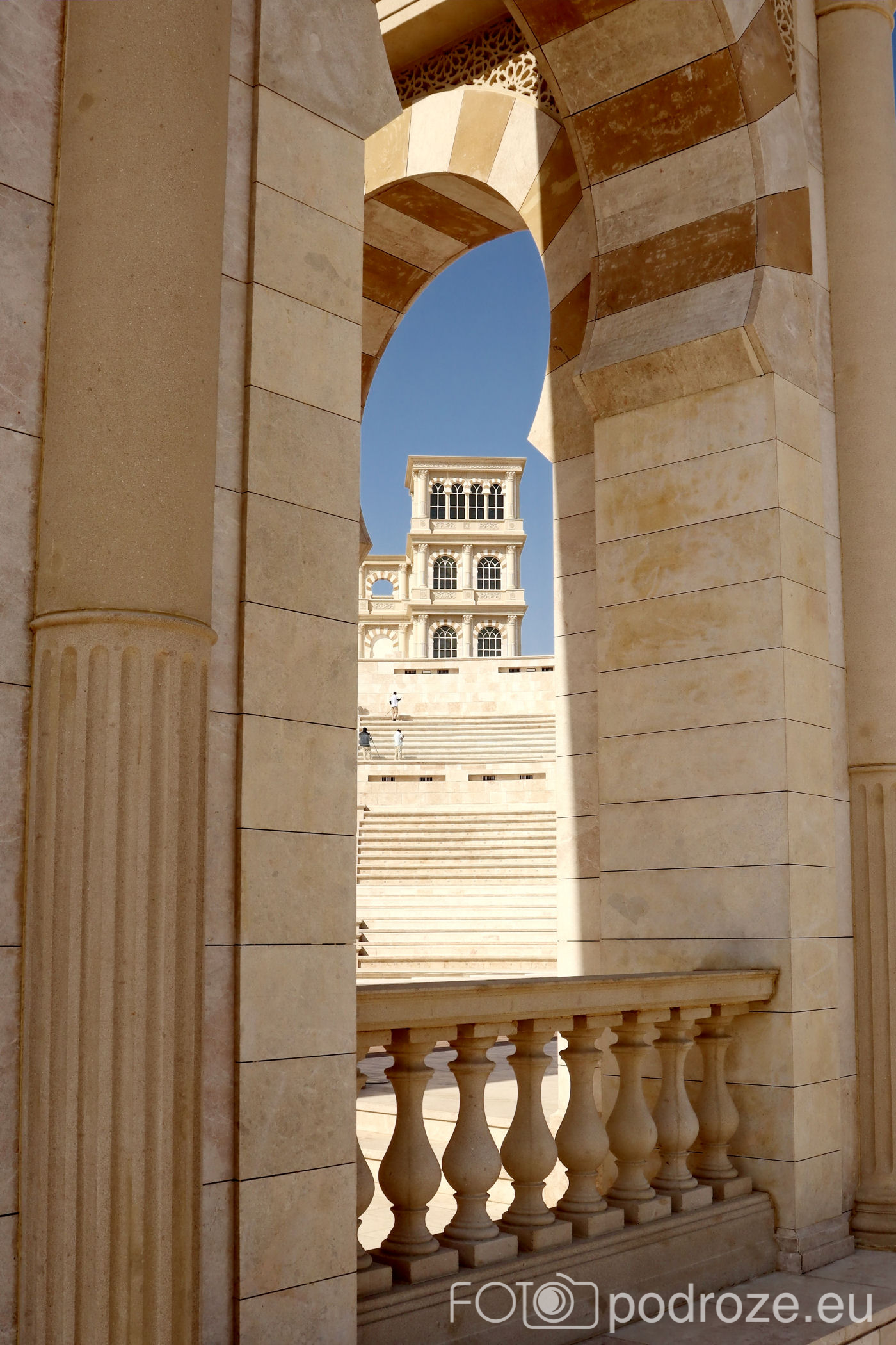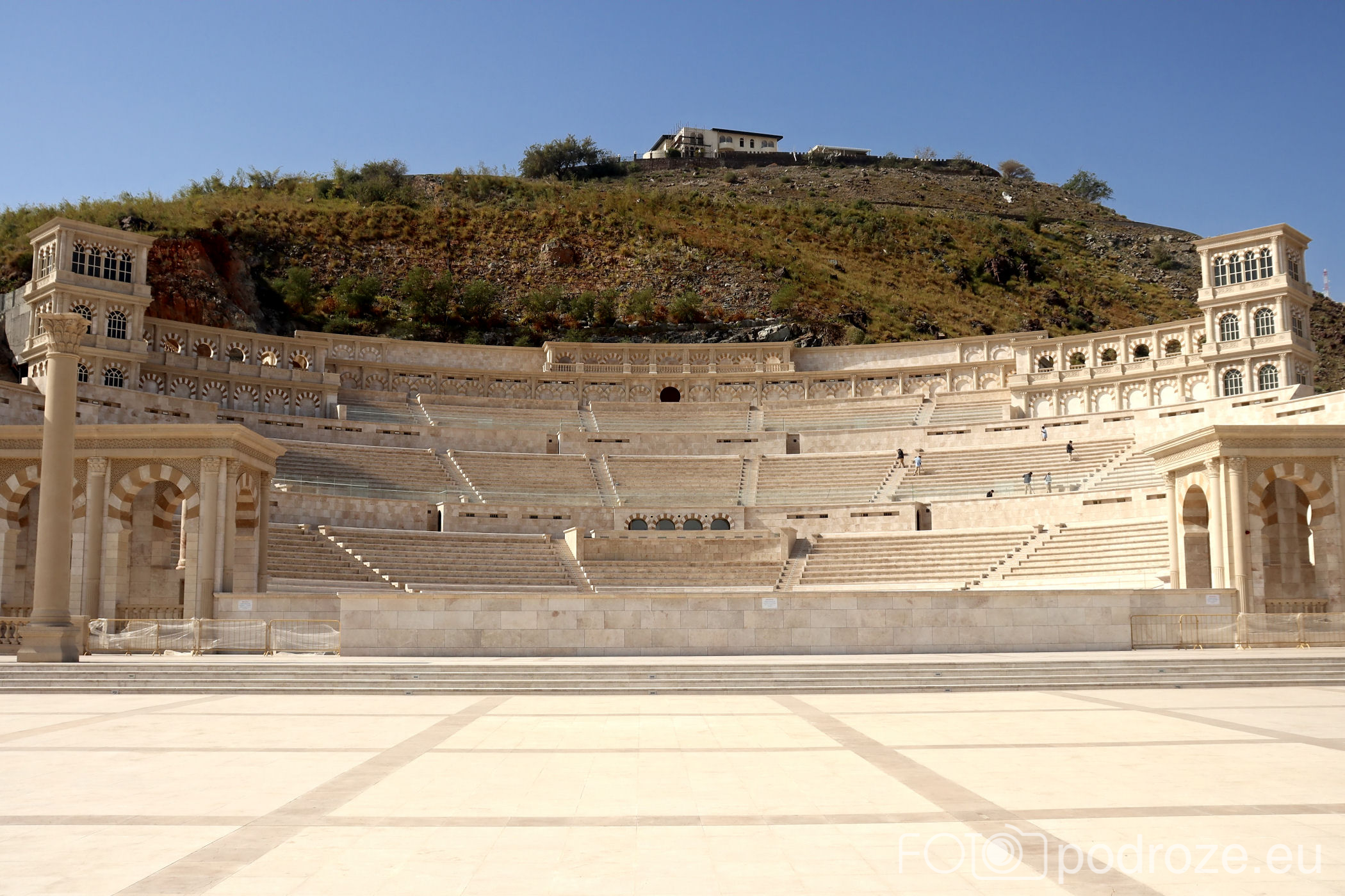 A jak szejk zażyczy sobie starożytny amfiteatr to będzie miał i jego. Oczywiście ten jest współczesny, dopiero co wybudowany, ale widać wyraźnie na czym wzorowany i stylizowany. Obok wielki stadion sportowy, a przed amfiteatrem ogromny plac i park. Trafiliśmy tu w środku dnia, po za nami nikogo nie było.