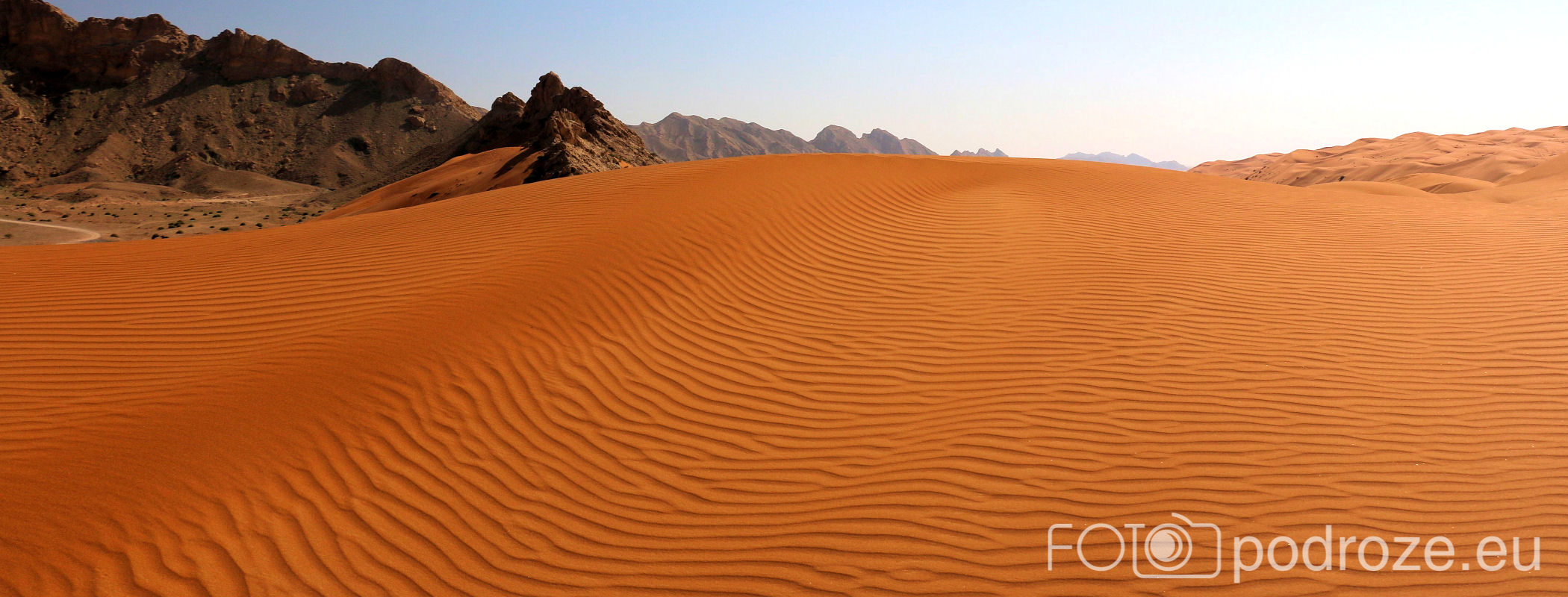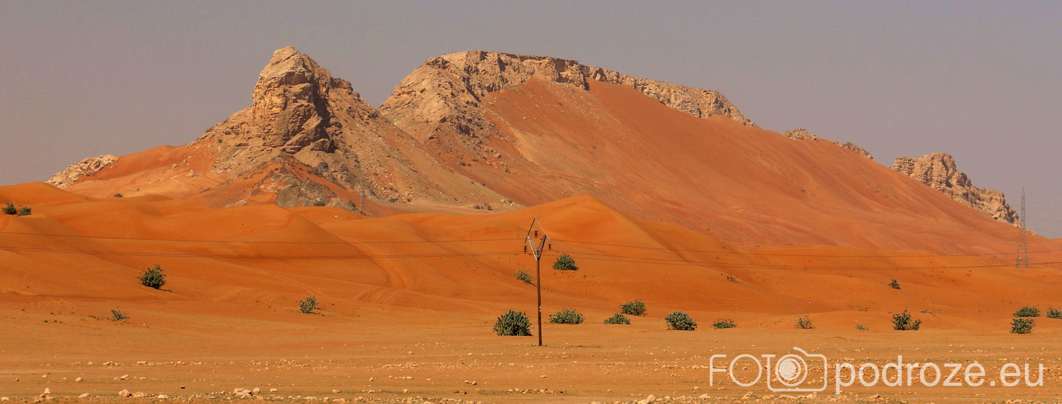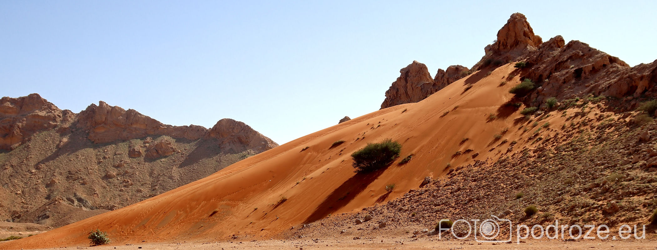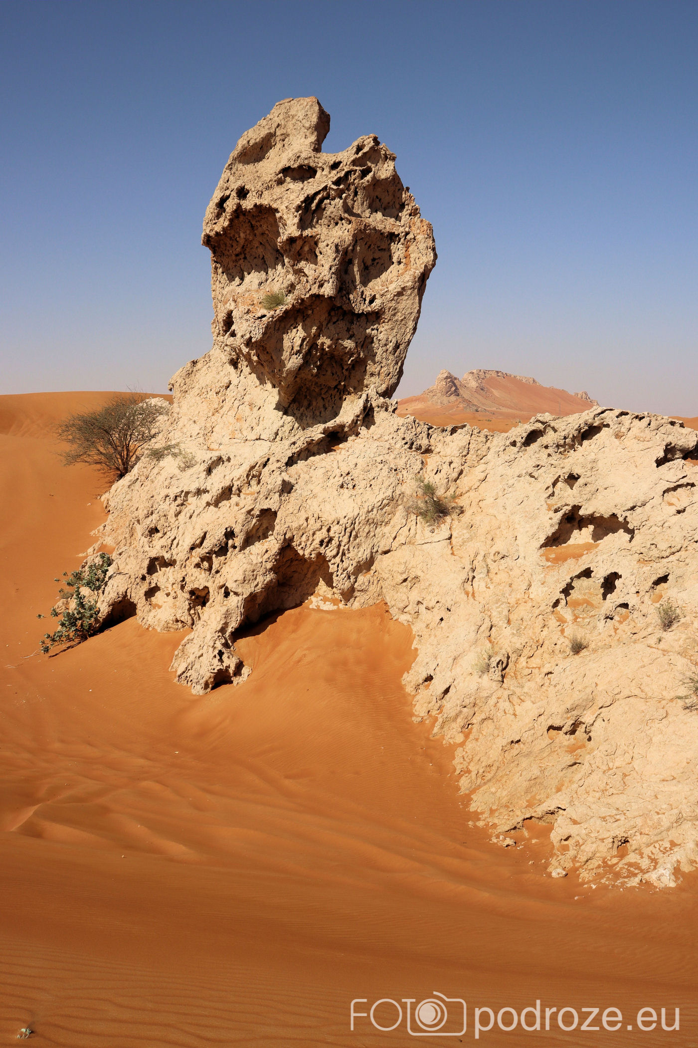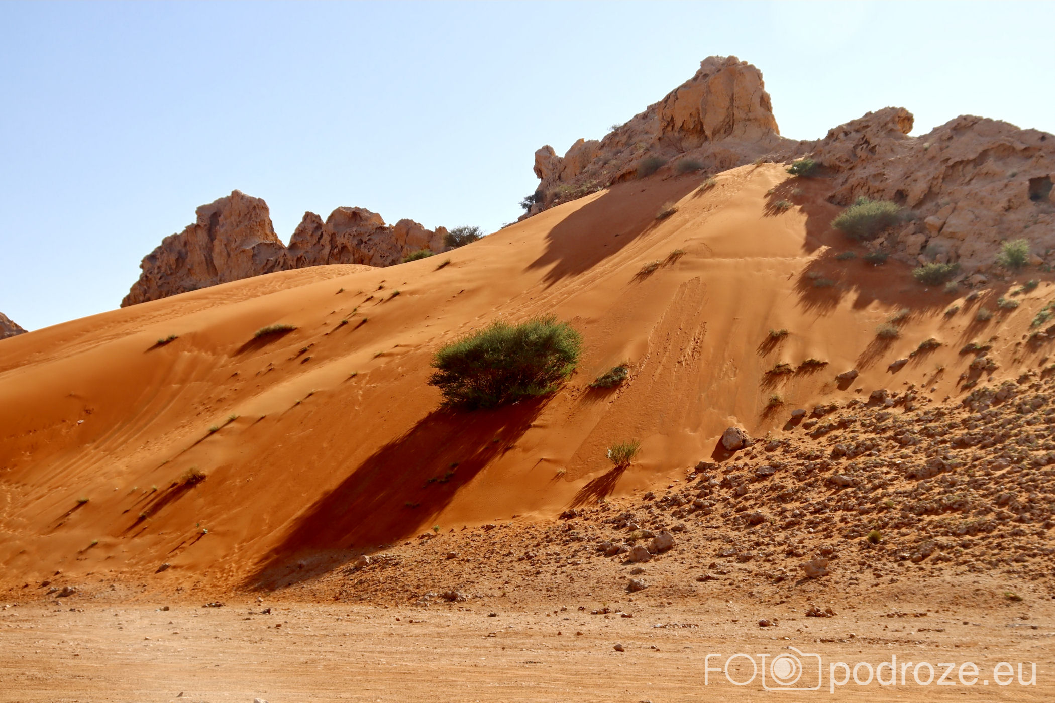 To co w tym miejscu najpiękniejsze to kolor piasku i okoliczne skały. Mamy tu całe potężne wzniesienie AL FAYA , które oddziela pustynię od miasta i głównej drogi. Naprzeciwko piękne góry ze szczytem FOSSIL. Potem zaczynają się wydmy ze skałami w kształcie SFINKSA oraz skalne łuki. Po drugiej stronie gór także odnajdziecie jaskinie. A jak będziecie mieć szczęście to spotkacie stada wielbłądów. Czyli wszystko to co może kojarzyć nam się z krajem na tej szerokości geograficznej.
