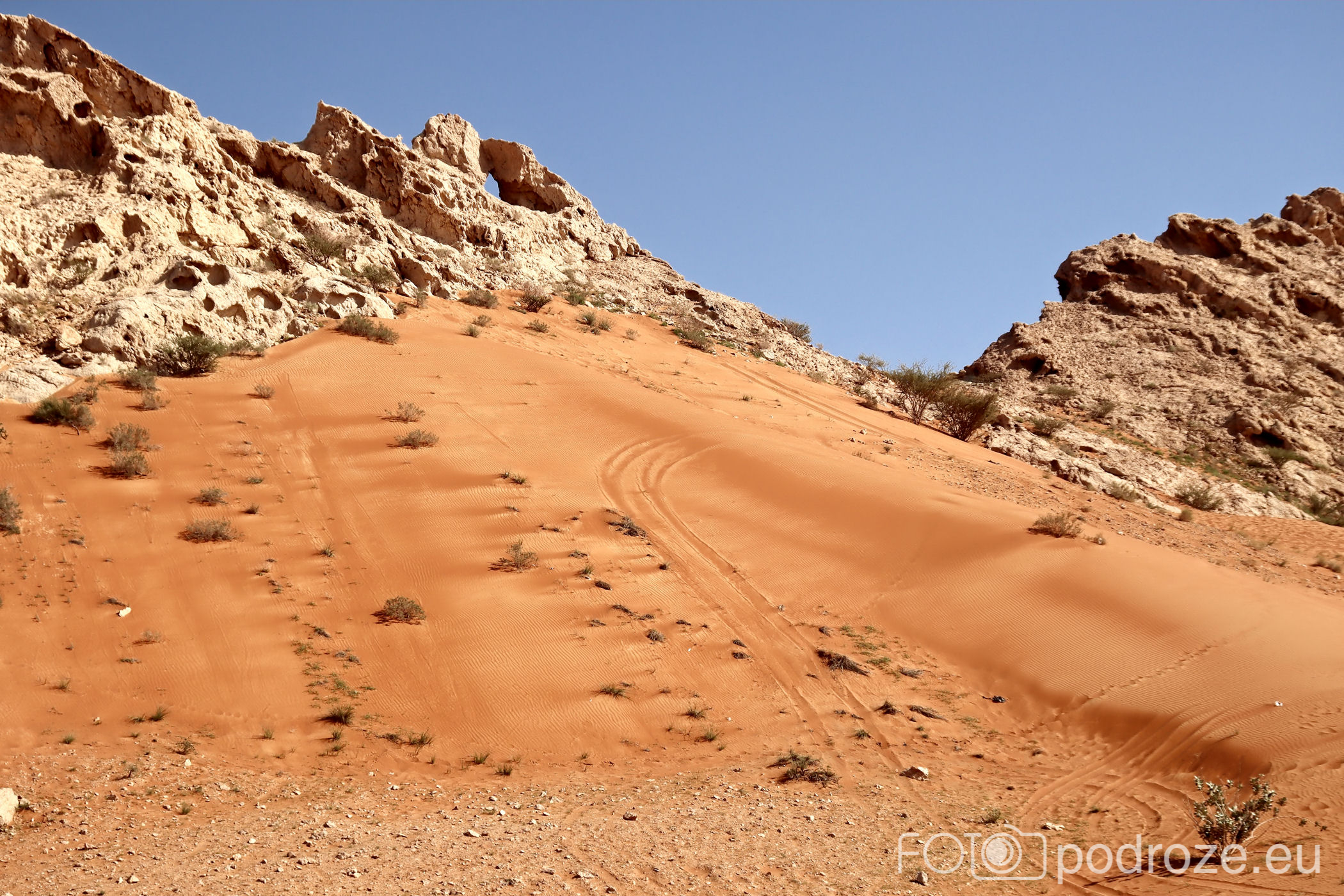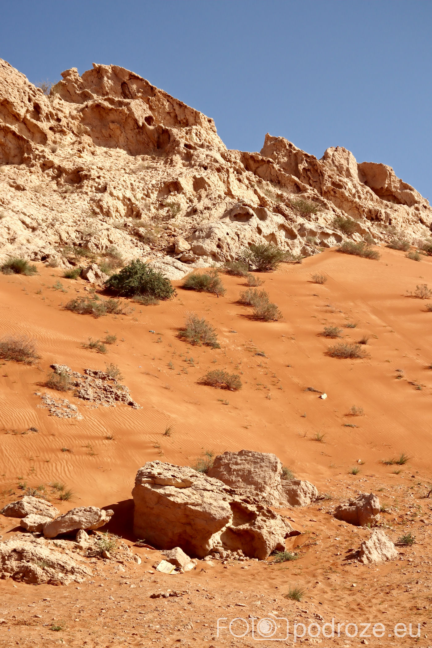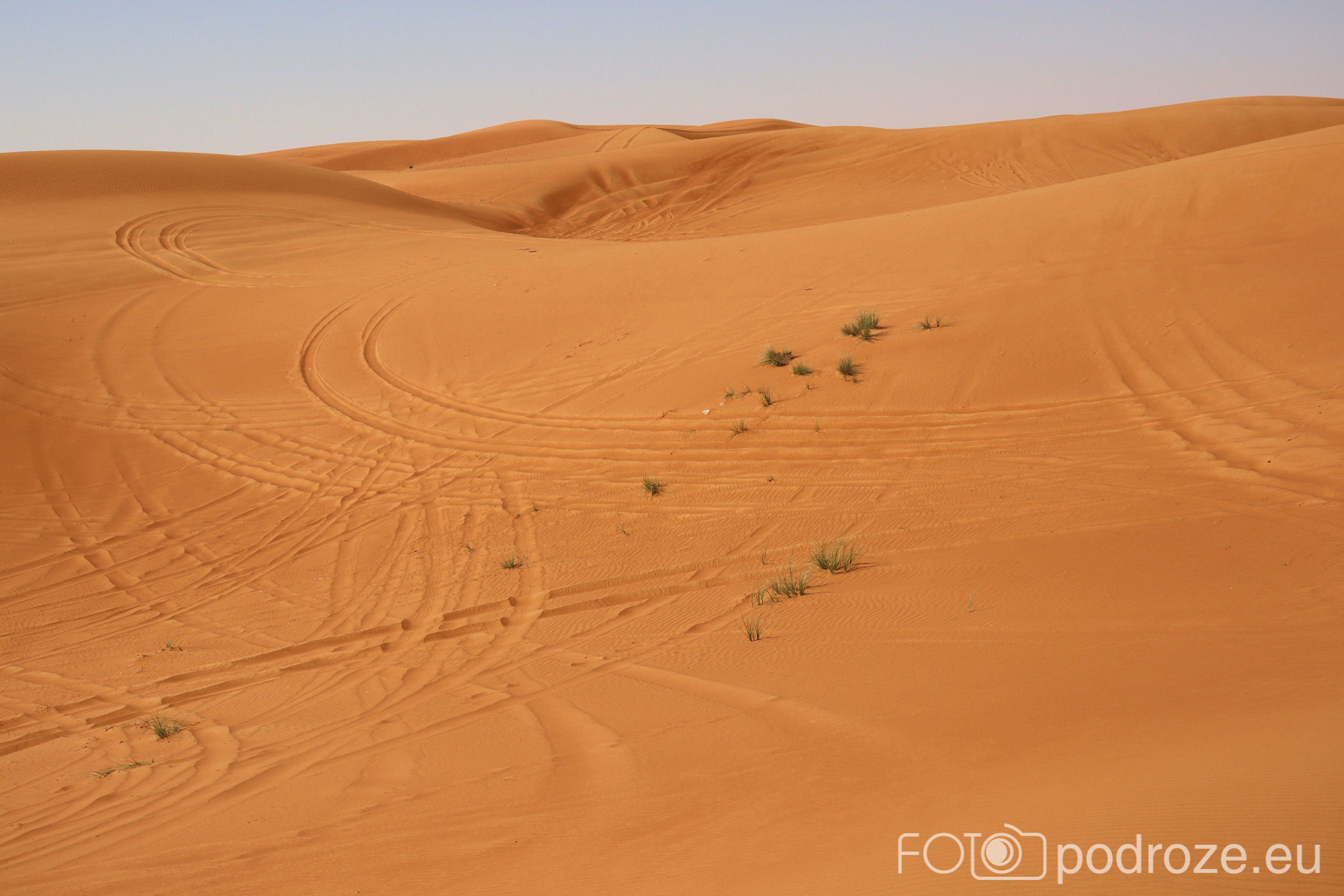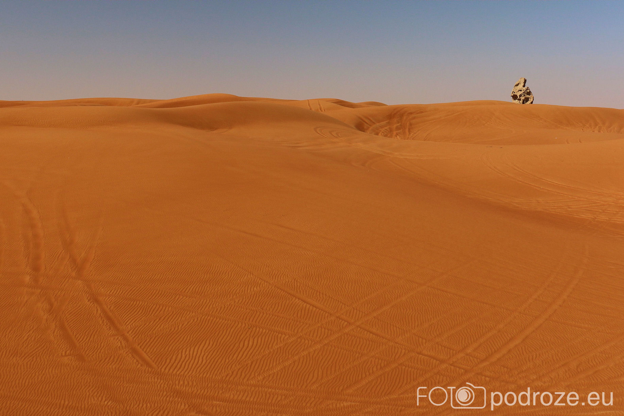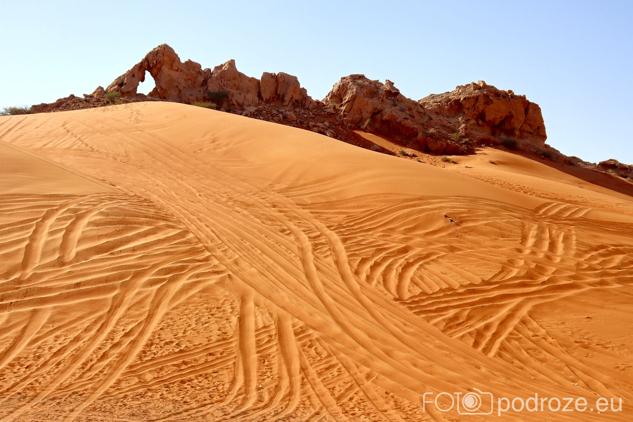 Skały są malownicze, ale to właśnie pustynne wydmy chcieliśmy zobaczyć najbardziej. Gdyby jeszcze na piasku nie było śladów kół samochodów. Ale taki już urok Emiratów, tu każdy i wszędzie jedzie i wjeżdża swoim 4×4 . Takich jak my tu nie ma, którzy cieszyli by się tym, że po piasku po prostu mogą pochodzić, albo na nim posiedzieć lub poleżeć .
