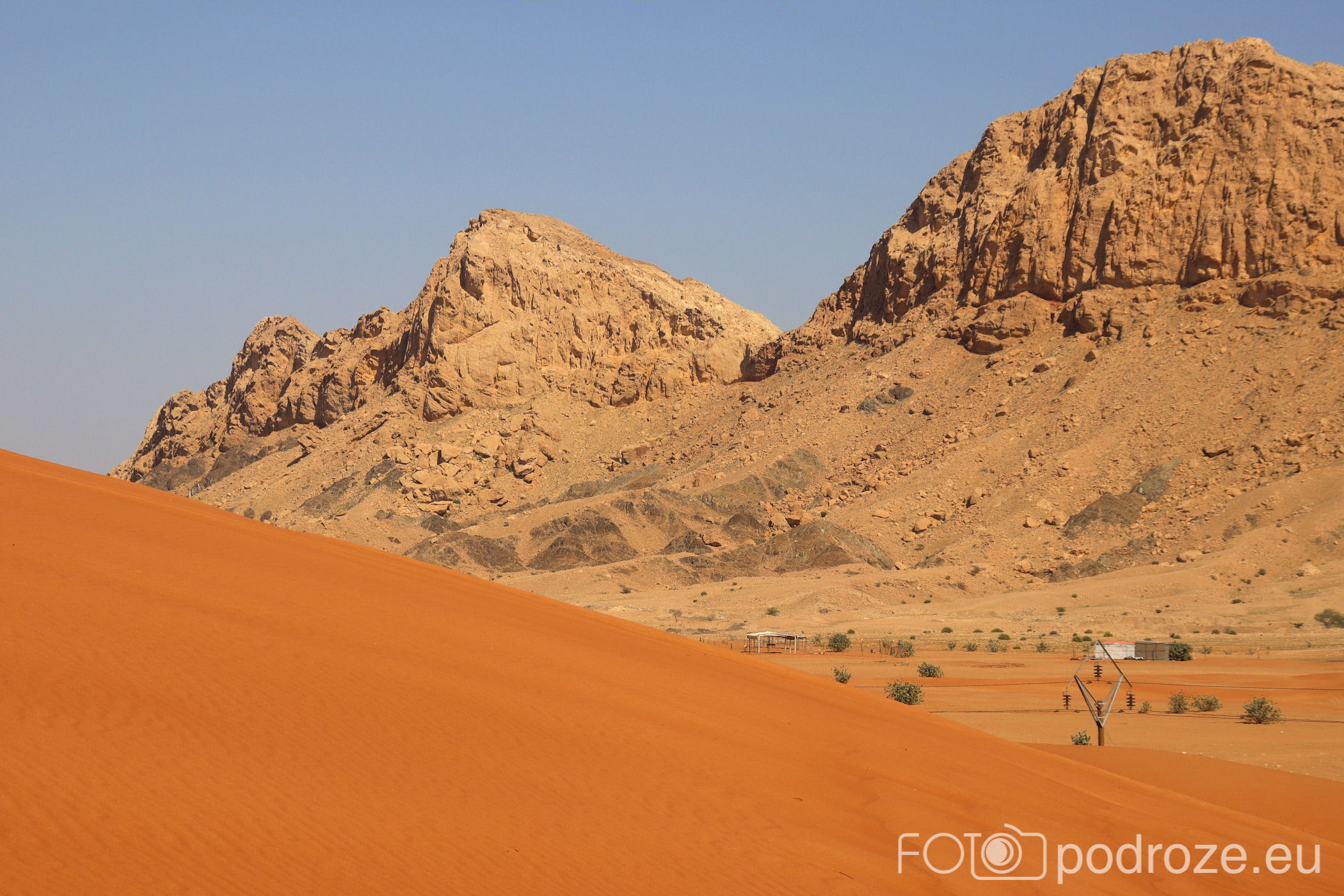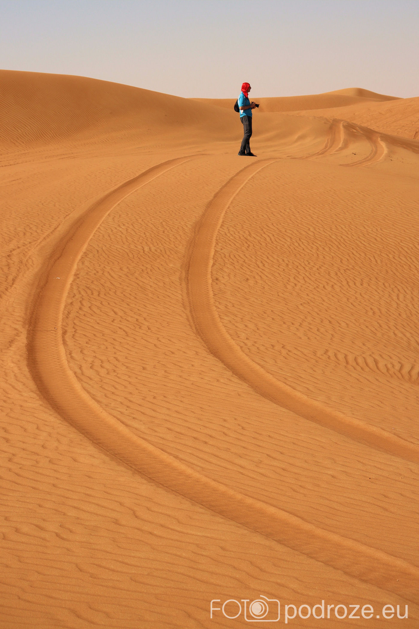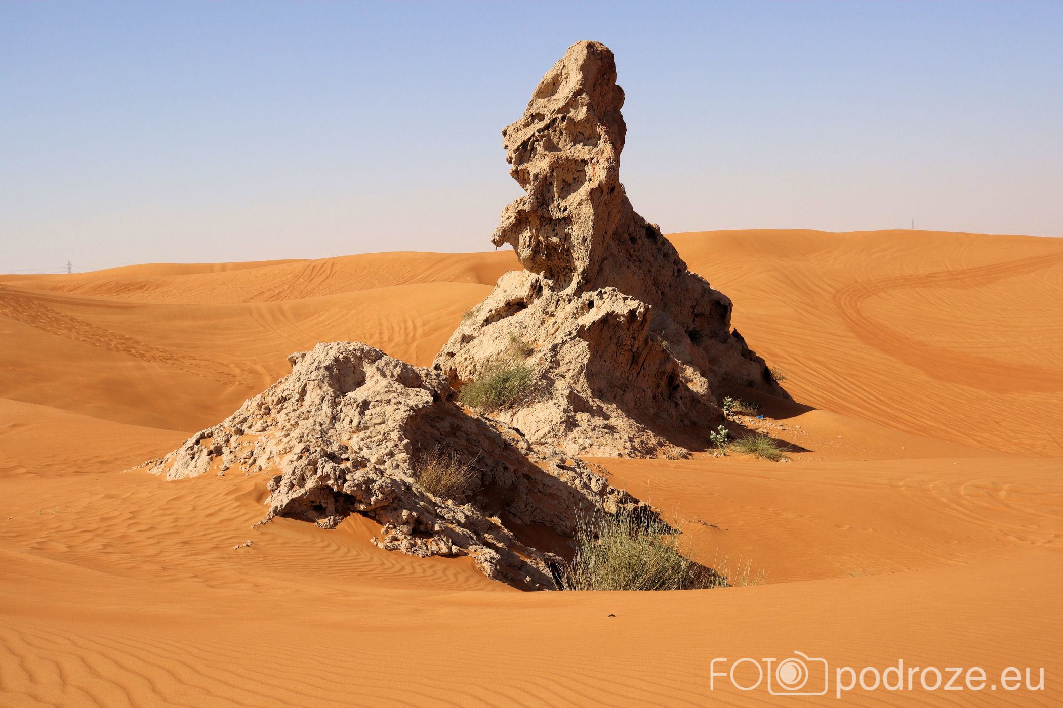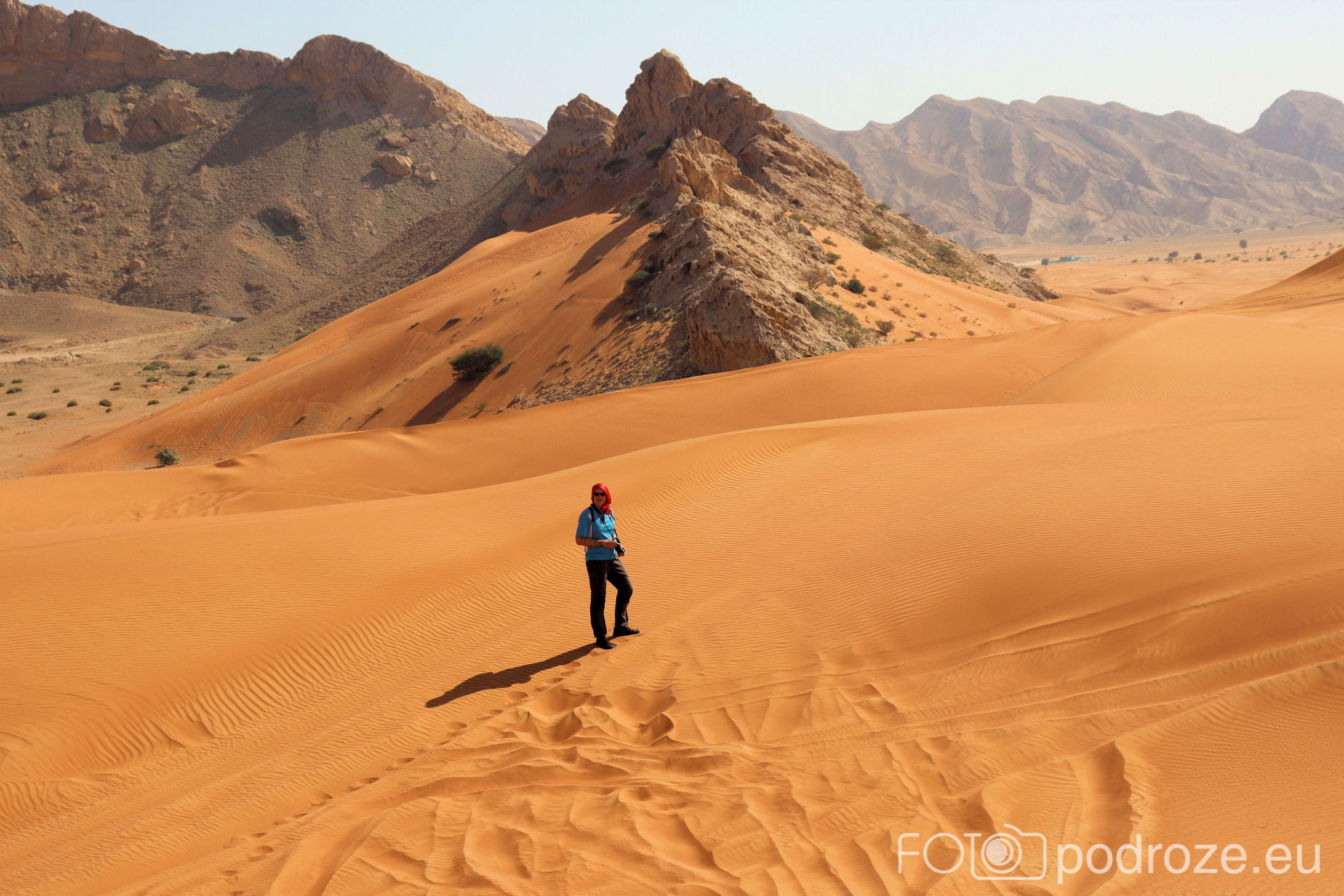 Skały są malownicze, ale to właśnie pustynne wydmy chcieliśmy zobaczyć najbardziej. Gdyby jeszcze na piasku nie było śladów kół samochodów. Ale taki już urok Emiratów, tu każdy i wszędzie jedzie i wjeżdża swoim 4×4 . Takich jak my tu nie ma, którzy cieszyli by się tym, że po piasku po prostu mogą pochodzić, albo na nim posiedzieć lub poleżeć .