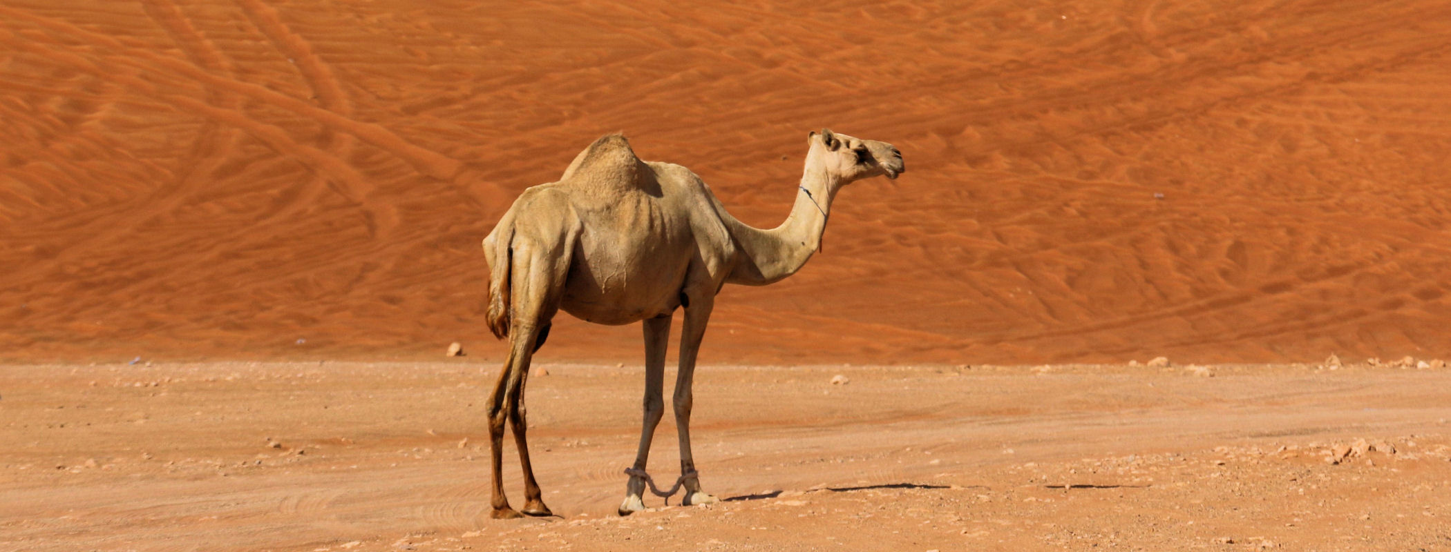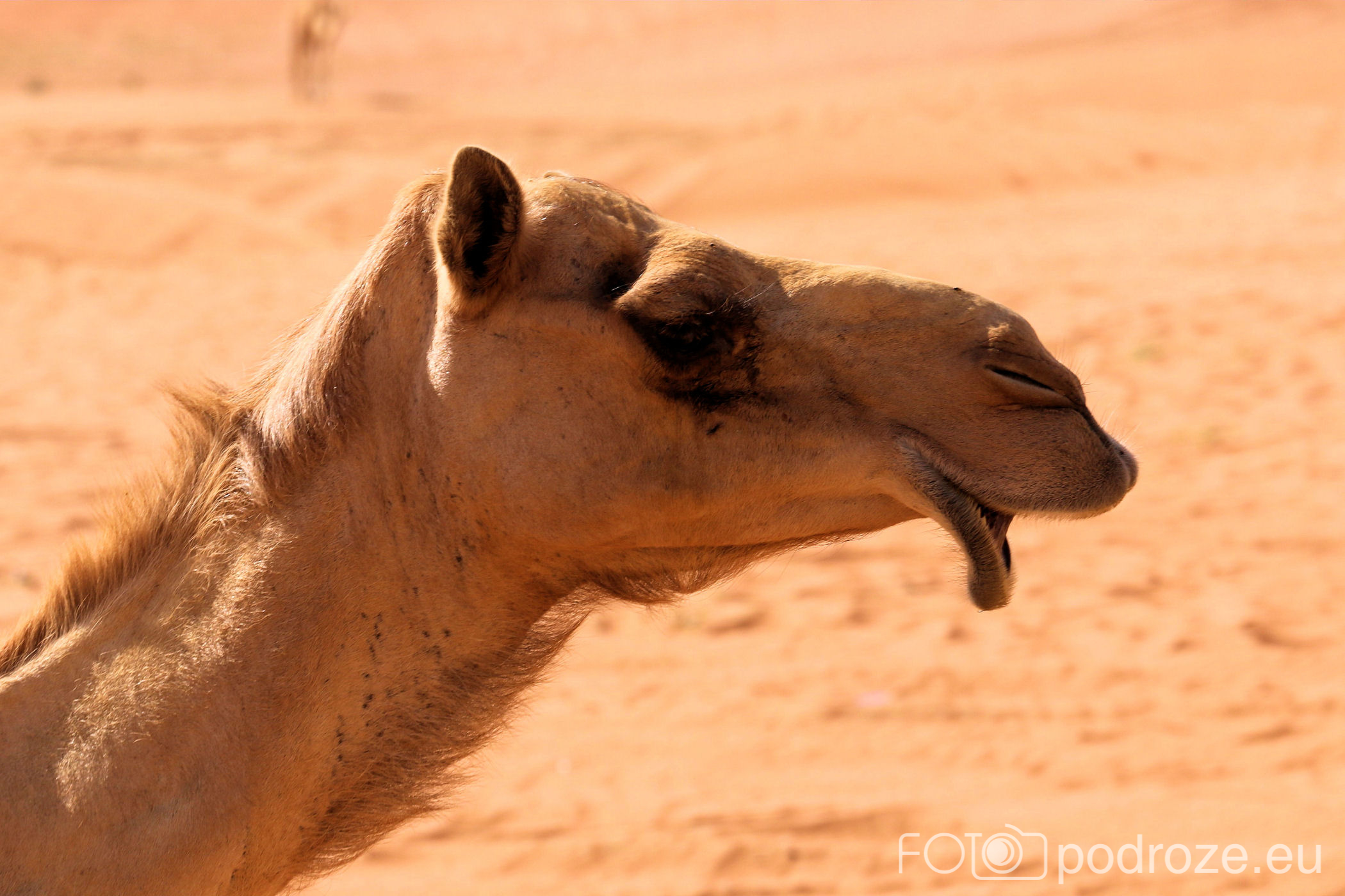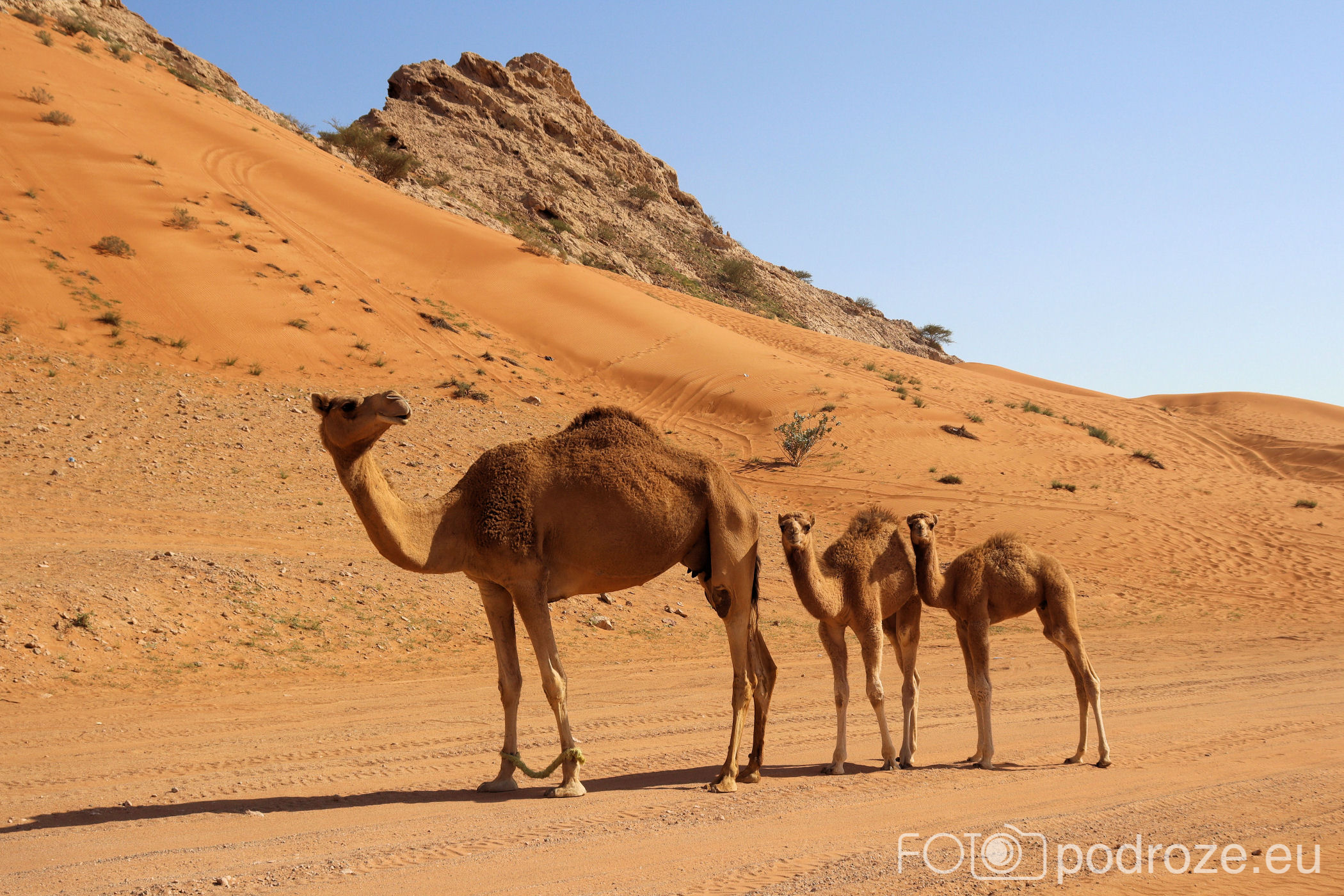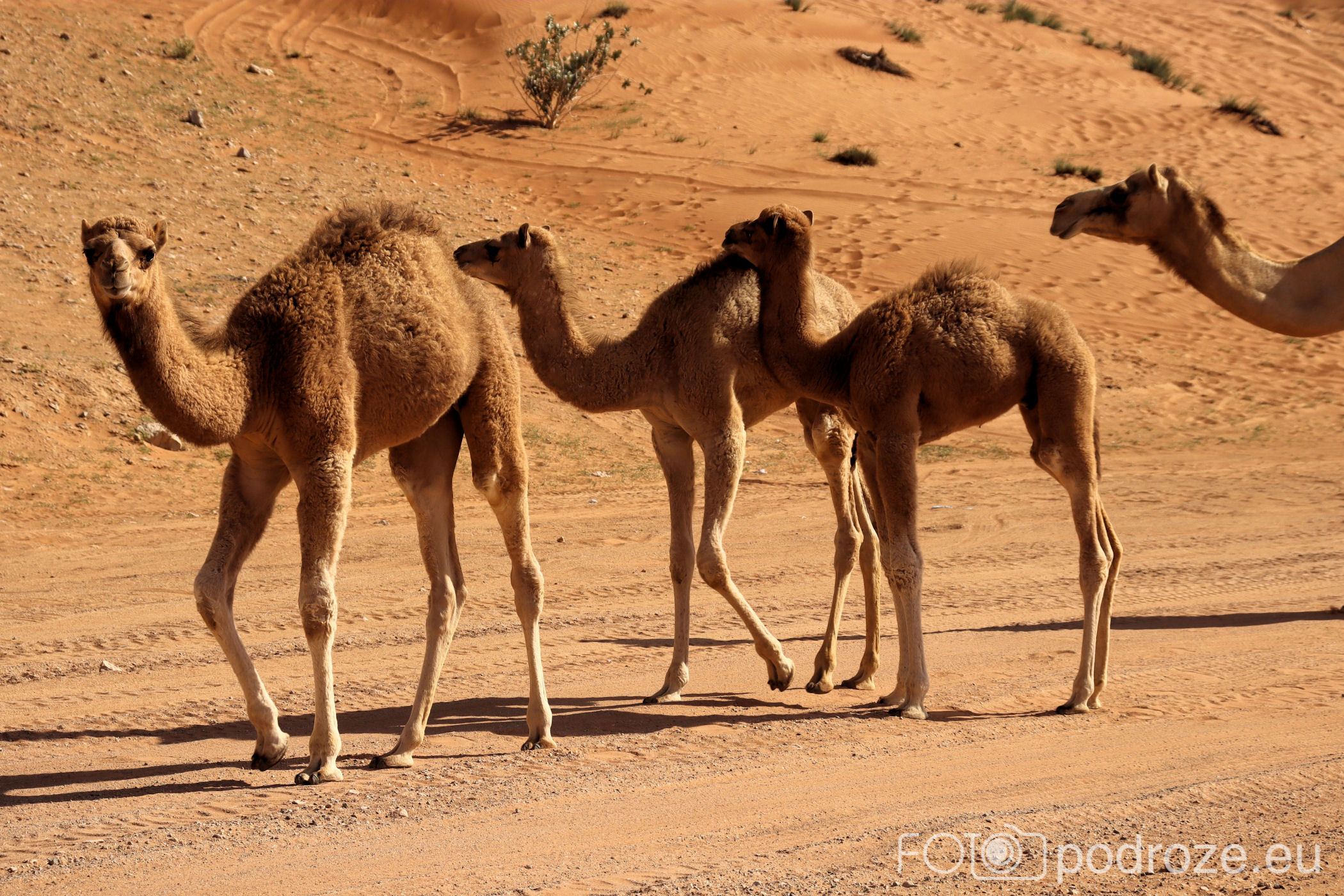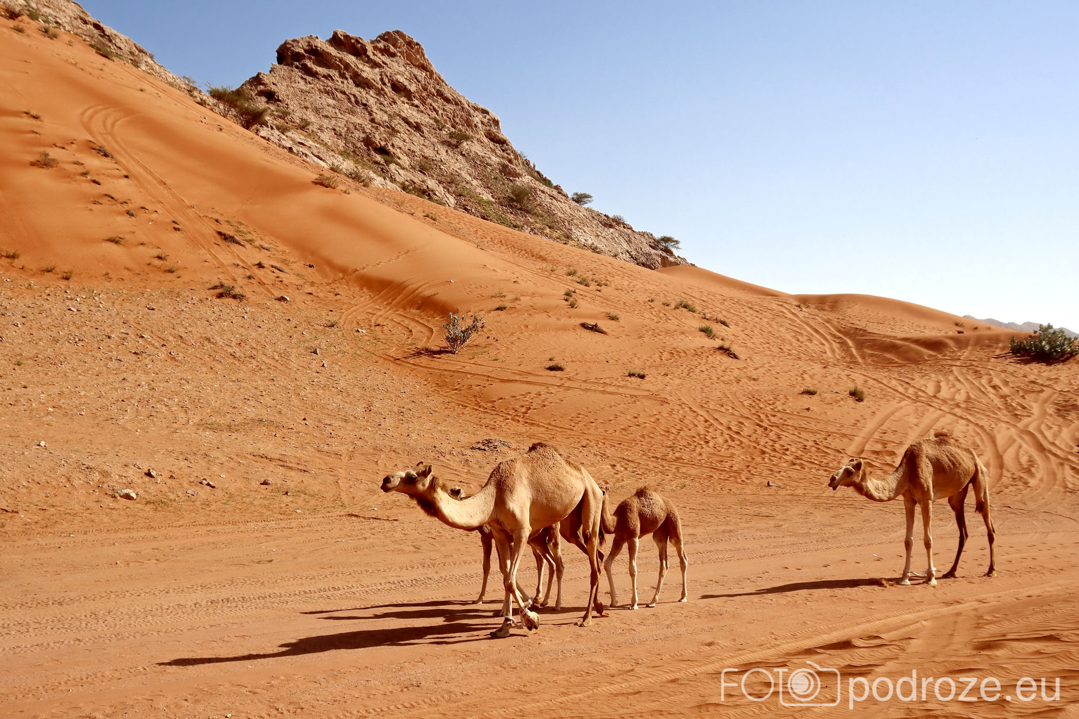 Jest pustynia, muszą być i wielbłądy. Pasące się stadko wypatrujemy z góry, potem podjeżdżamy z drugiej strony wzgórza, bo właśnie Arab przepędza je na drugą stroną swoim dżipem. To też znak czasów. Kiedyś, a było to całkiem niedawno, pasterz jechał na wielbłądzie lub ośle.